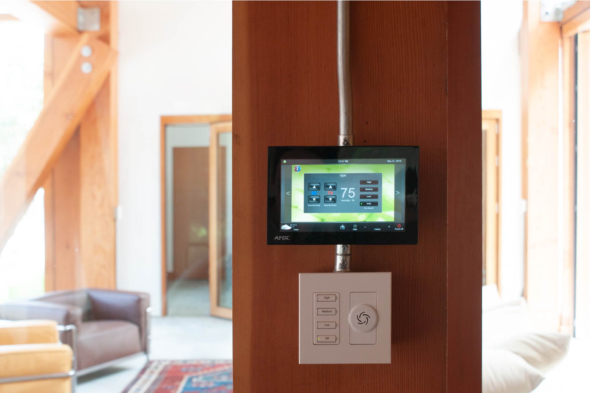 Solar gains are limited by roof overhangs, a selective double glazing and a motorized freely ventilated interior shading with a room-side low-e coating. The view of the Pacific Ocean should remain as unobstructed as possible, which was achieved by a residual transparency of the solar shading even when closed. In addition, works of art in the house had to be protected from direct sunlight. The cross-ventilation driven by the wind and supported by the open construction via the chimney effect dissipates external and internal heat loads via the gable openings.