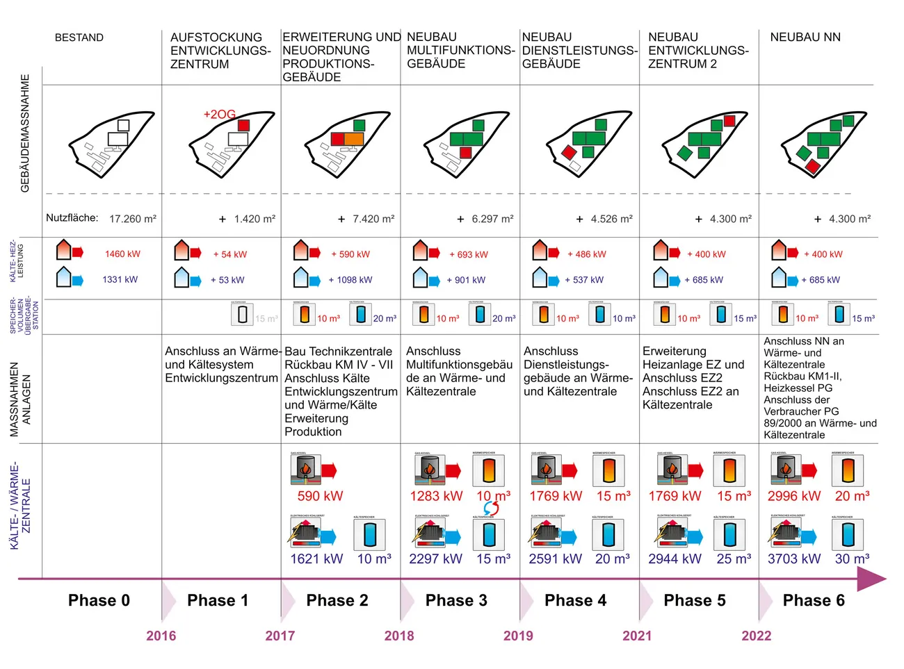 Transsolar hat zwei Masterpläne parallel entwickelt, einen für die Gebäudeentwicklung, den anderen für die zukünftige Energieversorgung des Campus. Als Grundlage für die Hochrechnung des zukünftigen Leistungs- und Energiebedarfes wurden die Installationen und der Bedarf der Bestandsgebäude untersucht. Ausgangspunkt war eine Analyse der Bedarfsstruktur für Wärme und Kälte, um mögliche Synergien aufzuzeigen. Mit den Anlagen aus den Bestandsgebäuden als Basis wurden für die aufeinander folgenden Entwicklungsschritte die Bedarfswerte der Leistungen für Wärme und Kälte ermittelt: Aus Messdaten dieser bestehenden Anlagen, sowie dynamischen Berechnungen zum Heiz- und Kühlbedarf der Gebäude hat Transsolar Bedarfsprofile entwickelt. Diese geben Aufschluss über das gleichzeitige Auftreten von Wärme- und Kältebedarf. Unter Berücksichtigung der geplanten Nutzungen in den neuen Gebäuden erlauben diese Bedarfsprofile eine Hochrechnung auf die jeweilig geplanten Ausbaustufen. Aus diesen wiederum wurden die Potenziale für die Rückgewinnung von Abwärme ermittelt, was eine Vordimensionierung der daraus resultierenden Anlagentechnik erlaubt.