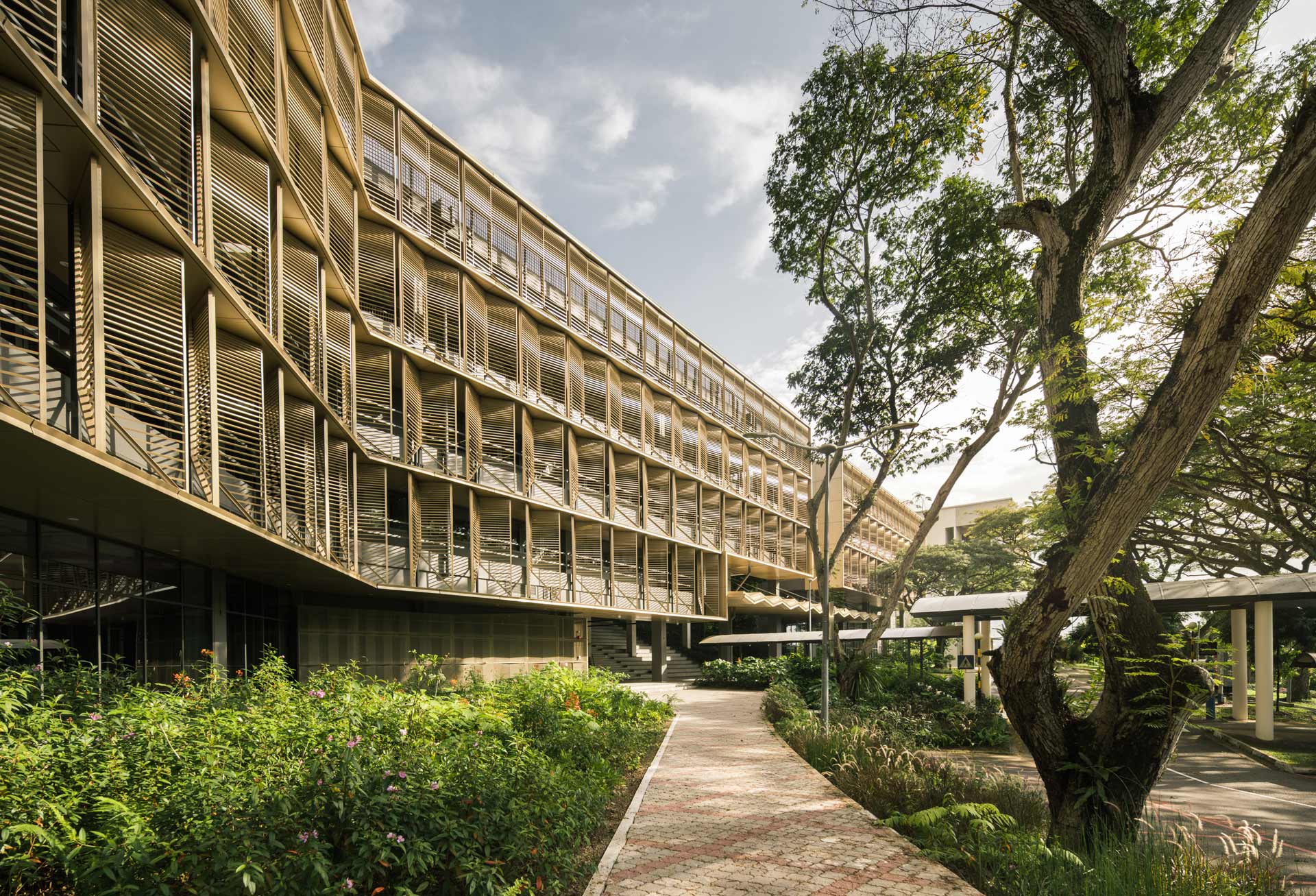 Pour optimiser les conditions environnementales, une séquence alternant espaces extérieurs, de transition, et intérieurs a été imaginée. Les zones thermiques ont été disposées en fonction du programme et des exigences environnementales. De nombreux espaces ont été conçus comme des espaces extérieurs, protégés du vent, de la pluie et de l'éblouissement, mais avec un bon accès à la lumière du jour et une excellente ventilation naturelle. Les principales zones du programme fonctionnent désormais avec des intervalles de température et d'humidité plus larges grâce à un système de refroidissement hybride combinant ventilateurs plafonniers et système de refroidissement à passage unique pour un excellent apport d'air frais. La différence de température entre les espaces intérieurs et extérieurs est réduite, ce qui permet de passer en douceur d’un espace mécaniquement tempéré à une ventilation naturelle et augmente considérablement la valeur de la conception des façades et du zonage thermique des bâtiments tropicaux pour la ventilation naturelle.
