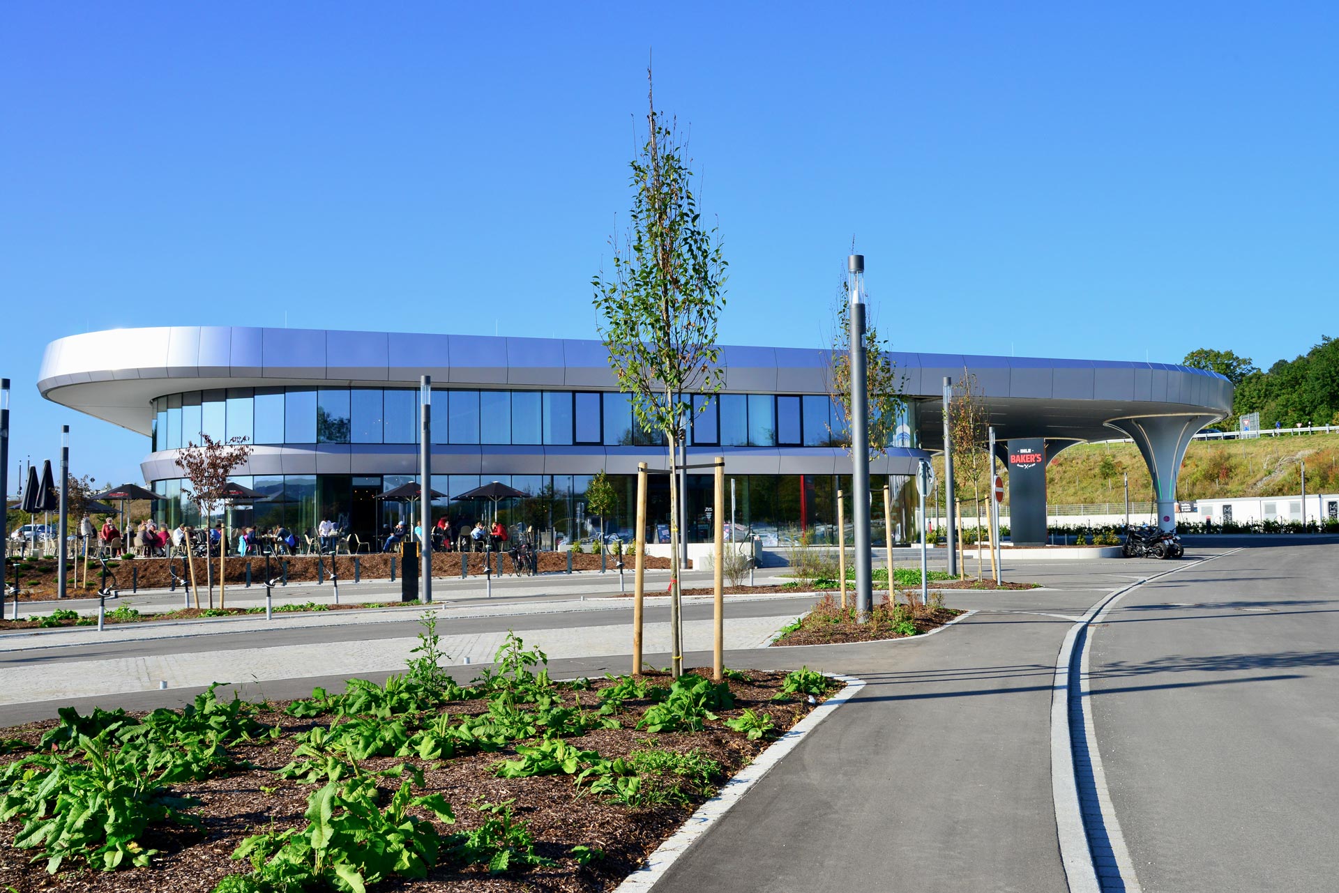 La plus grande station-service solaire du monde se trouve actuellement sur l'autoroute A8, à côté de de Zusmarshausen, en Bavière. Au terme de l'extension du parc d'innovation Sortimo, 120 bornes de charge normale (max. 60 kW) et 24 bornes de charge rapide (max. 350 kW) permettront de recharger quotidiennement jusqu'à 4000 véhicules électriques avec de l’électricité "verte". Afin d'utiliser intelligemment le temps d'attente, le campus offrira aux électromobilistes un café, des possibilités d'achat ainsi que des bureaux et des salles de conférence équipés de techniques de communication innovantes.