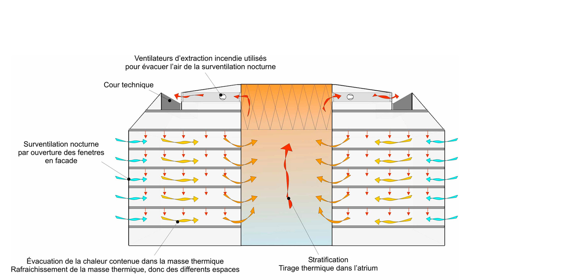 - Un atrium, fonctionnant tel un puits de lumière naturelle, crée une ambiance agréable et lumineuse au cœur du bâtiment, réduit les consommations d’éclairage artificiel des espaces centraux et sert au tirage thermique lors de la ventilation nocturne.