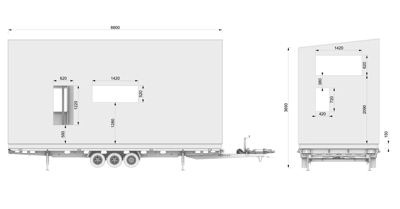 We started with the base dimensions of 6.60 m x 2.44 m (21.5 x 8 ft), the same as the trailer. The height of the house from the floor – including the height of the trailer – to the highest side (north facade) is 3.96 m. The maximum height allowed by road laws for mobile homes is 4 meters (13 ft), so we tried to use as much space as possible within the established boundaries. The height from the ground to the lowest point of the house (south facade) is 3.69 m (12 ft). This results in a roof with a slope of about 8° to the south, which allows snow melt and rainwater to easily move off the roof. Also, sloped roofs are generally structurally stronger compared to flat roofs and the southward slope increases the potential for energy generation from photovoltaic panels on the roof.