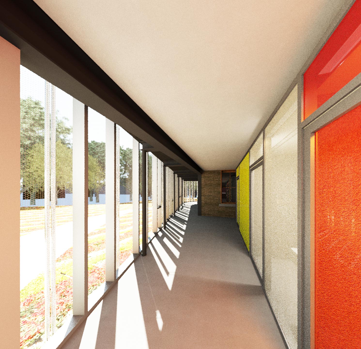 For the warm season, the concept uses physics and thermodynamics to support ventilation with buoyancy and stratification. The existing earth duct under the palm house is given an air inlet on the outside. The tunnel passively cools the air from outside, which is warm in summer; it is let into the existing buildings and the new greenhouse at ground level. Inside, the air heats up and rises to the ceiling, where it is extracted by motorized fans. The entire volume of air flows out of the new greenhouse through the chimney of the existing boiler house, which now functions as a solar chimney. Its chimney effect gives the ventilation natural propulsion for an air exchange rate of up to 10 times per hour. An additional cooling option is provided by connecting the intake air flow to the geothermal field under the new greenhouse with a heating/cooling coil. As in the past, whitewashing from the outside protects against high solar gains through the facade of the stock during the summer. A flexible, mobile PV system takes over this task on the new building. Mounted on the roof, it prevents part of the solar energy from penetrating and converts it into electricity. It is flexible and can be removed and stored rolled up during the winter.