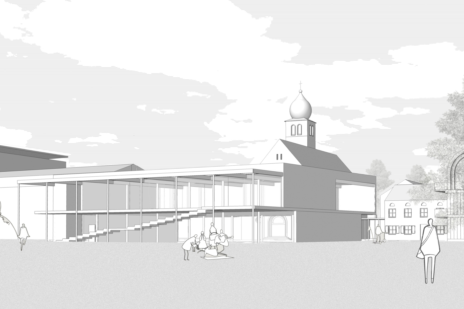The building has two levels: A gymnasium that is slightly lowered into the ground, above which are the rooms of the day care center.