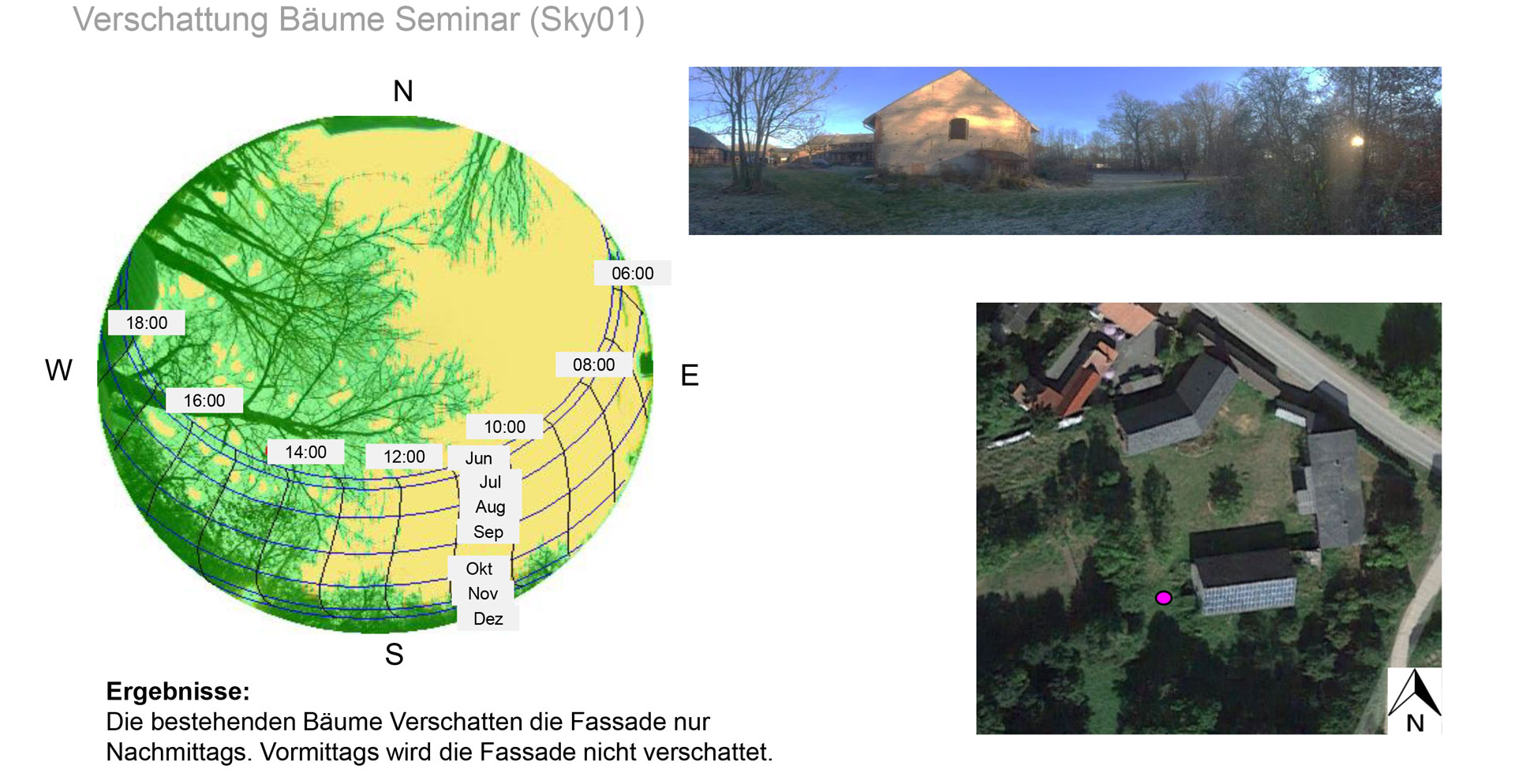 Shading studies were also carried out on site to determine what influence the trees have on the glass façades of the "wellness" and "seminar" areas due to the shadows they cast. A camera with a fisheye lens was used. It provides an image of its entire surroundings like a hemisphere, which appears unusual and distorted, but whose purpose is to precisely capture all the surrounding objects in one single snapshot. The sun paths associated with the camera's location are subsequently added to such an image, showing the course of the sun during the day at different times of the year. This makes it possible to determine when and for how long the camera's location is either shaded by surrounding objects or exposed to the sun.