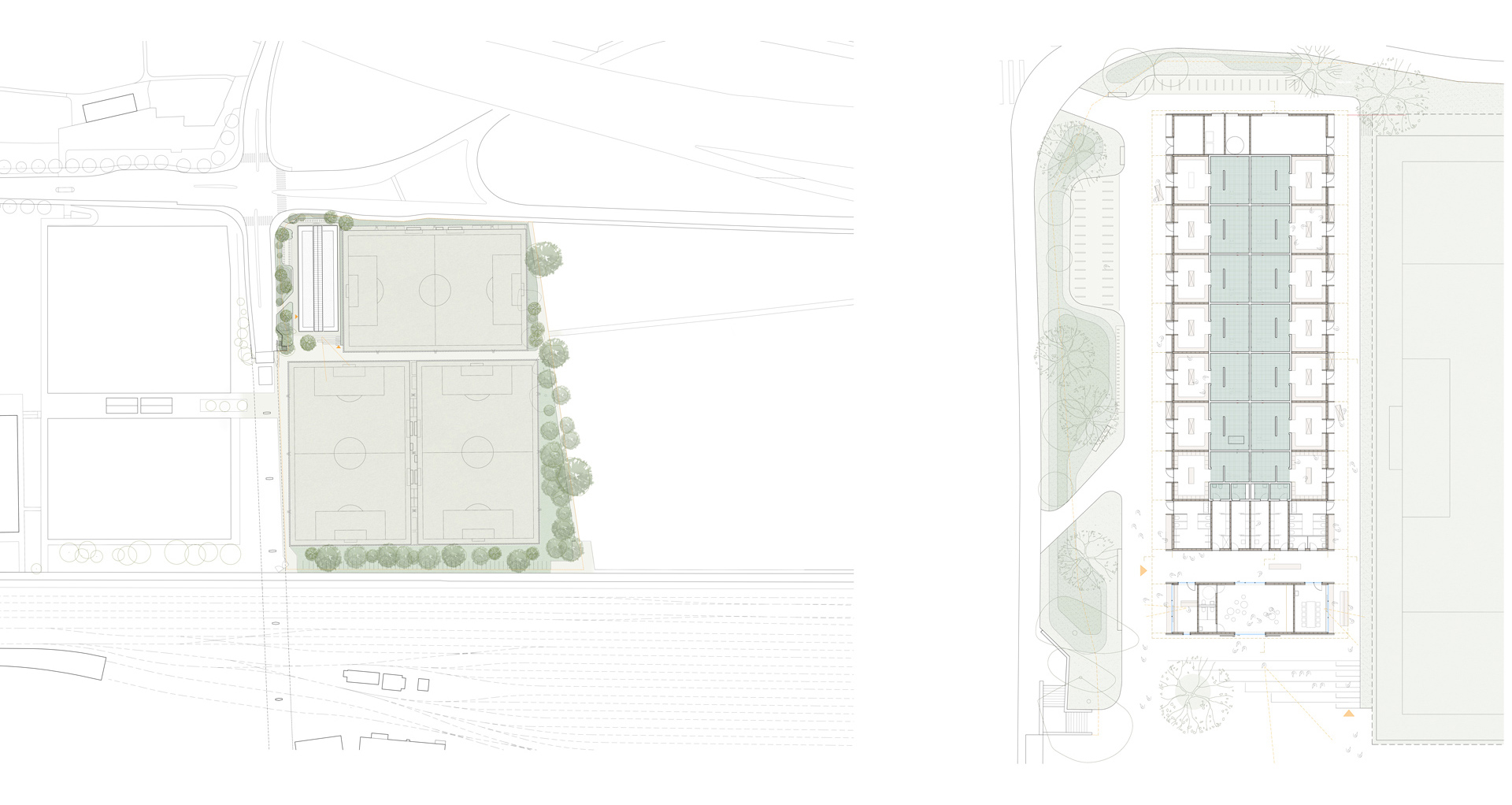 The two-part competition for building the new changing rooms at Juchhof 3 served the city as a pilot project for demonstrating how to apply this process in innovative architectural approaches and to enable the insights derived from the planning process to be transferred to other urban projects. The changing-room building is part of the Juchhof sports facility in the Altstetten district of Zurich, which, together with Juchhof 1 and 2, is already host to twenty-two football clubs and 102 teams. The need for additional capacity and the poor condition of the old structure meant a new build was necessary to house twelve changing rooms and showers, infrastructure rooms for coaches and referees, a foyer, and three standard artificial grass pitches.