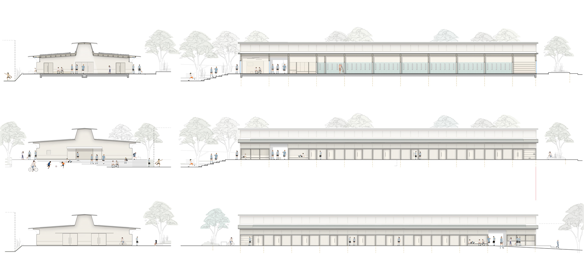 The robust, low-maintenance construction with its tried-and-tested materials is intended to enhance the service life of the building and has static and thermal properties that are optimally adapted to its use. Solid, untreated timber elements are envisaged for the construction of the roof and the exterior and changing-room walls. The dividing walls in the interior wet areas will be brick-built, while the floor slab and foundations will be made of waterproof reinforced concrete offering a high heat-storage capacity. The design’s archetypical barn form not only works with tried-and-tested, durable construction methods but also creates a low-key sense of intimacy and familiarity. (Guideline III)