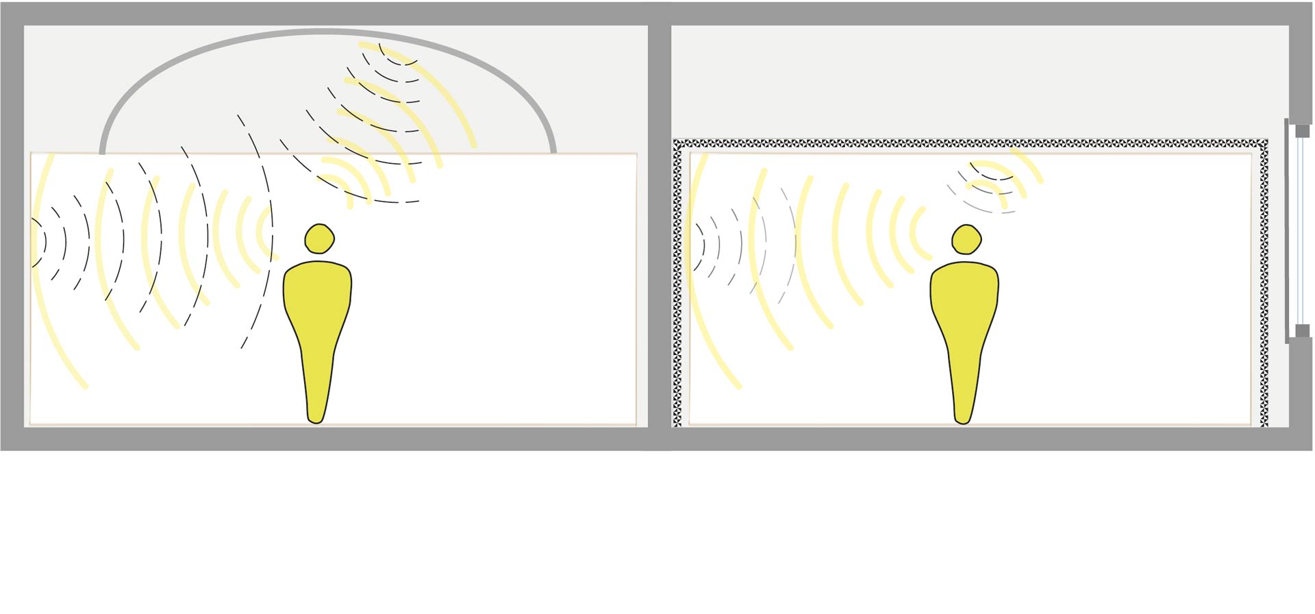The radically different properties of the rooms, which looked the same, were the result of precise measures that Transsolar had investigated in detailed modelling and simulations. In the exhibition as a 1:1 model, these were installed invisible to the visitors. Behind the visually perceptible clear room edges, for example, was a complex room geometry that generated the various effects of the reverberating room.