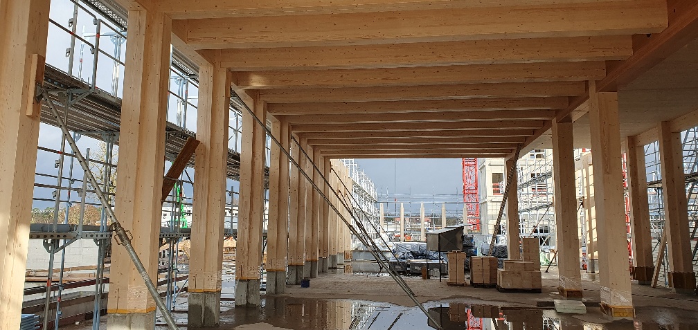 The wood-concrete hybrid structure for 3ipro is being built primarily using the pre-fab method.