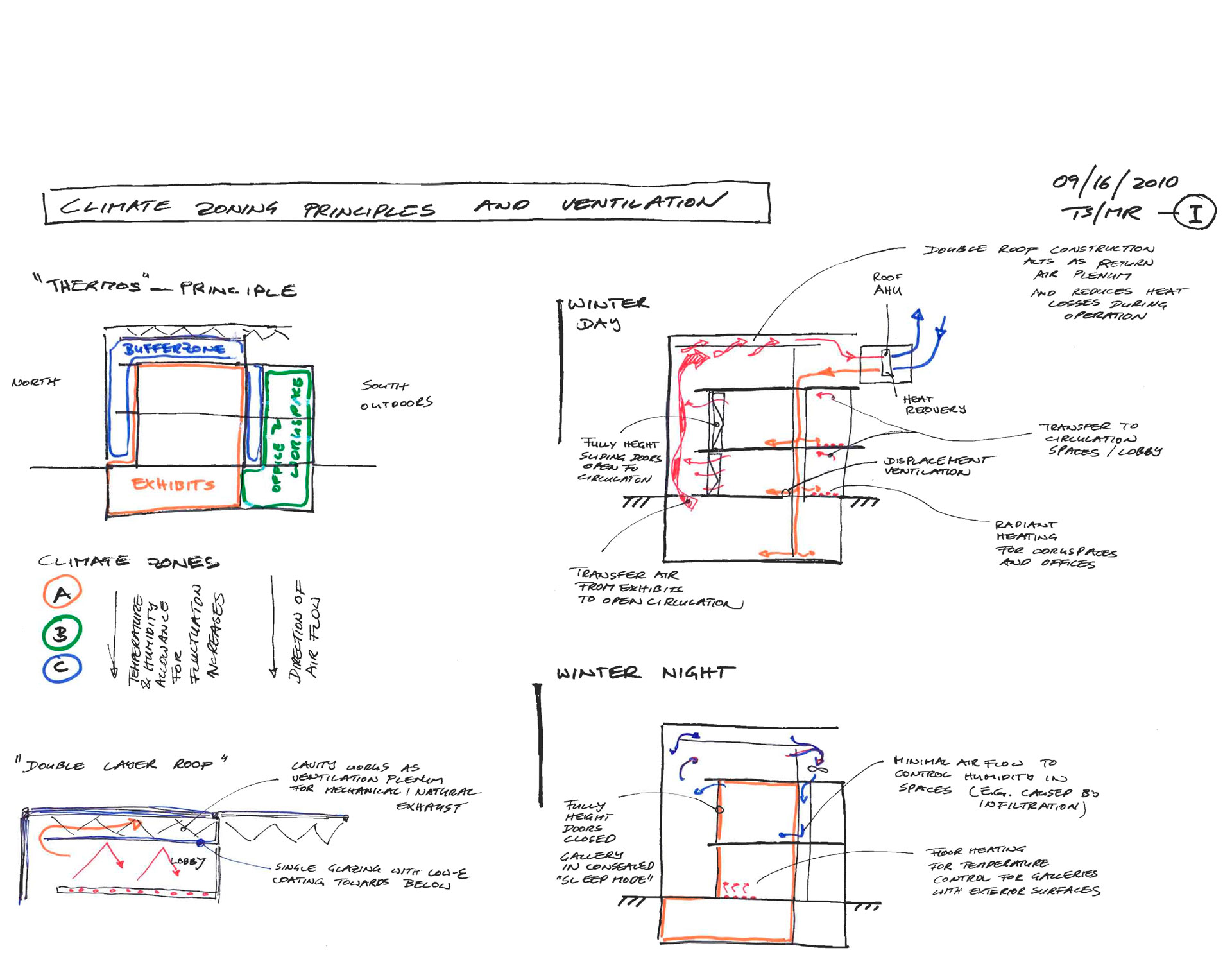 In addition, the remaining space conditioning requirements were met through highly efficient mechanical and energy systems. Geothermal and PV provided thermal energy and electricity to the museum, while radiant heating and cooling, as well as a dedicated outdoor air system efficiently provided the desired indoor environmental conditions. Maintaining these conditions for gallery spaces was also accomplished through strategic zoning of programming and the inclusion of thermal buffer zones into the layout of the building.