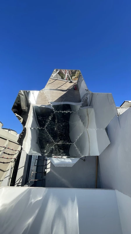 On the roof, a two-mirror heliostat system tracks the sun's path, continuously harvesting sunlight throughout the day and redirecting it into the Kaleidoscope shaft. The sunlight is then reflected downward, entering workspaces and public areas through specially designed openings in the cladding. To maximize the amount of reflected light and reduce its intensity, preventing glare, the team opted for a custom-built spherical convex mirror instead of a flat rectangular one. This secondary mirror, positioned directly above the Kaleidoscope shaft, was designed using parametric modelling and machine learning to achieve the optimal curvature. Inspired by NASA's James Webb Space Telescope, the mirror was constructed from seven hexagonal segments, each of them individually shaped and curved that combined result in the overall mirror shape.