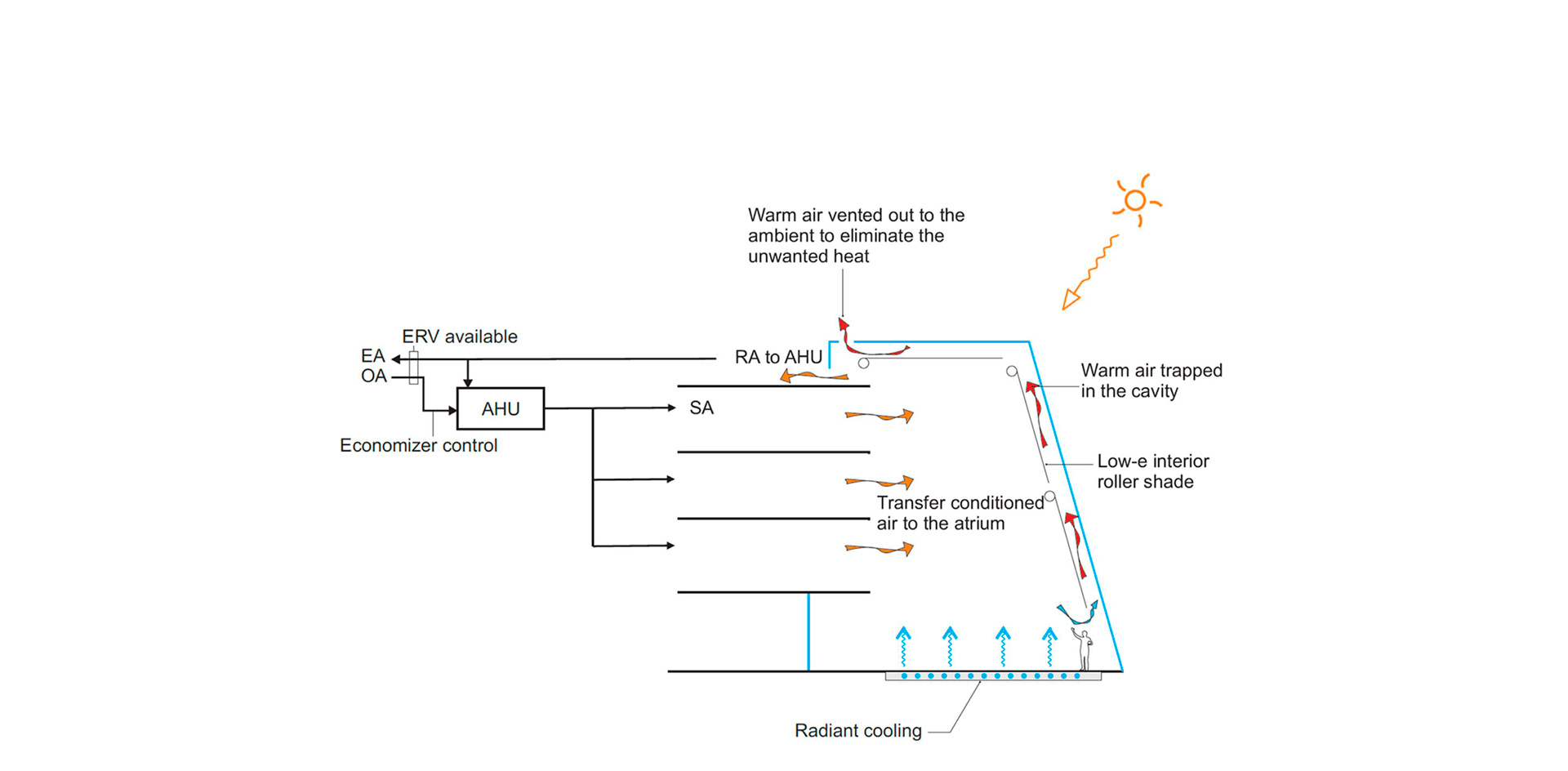 A striking addition of a glass hall on the west façade connects the four levels, providing a contemporary academic and public space to the building. In addition to promoting interior circulation, the glass hall provides daylight, views and natural ventilation to the original floor plate. Transsolar performed extensive thermal studies to detail the interior operable roller shading, including the specifications for materials, openness factor, location and functionality to provide optimum solar control and exhaust the heat built up in the glass hall.