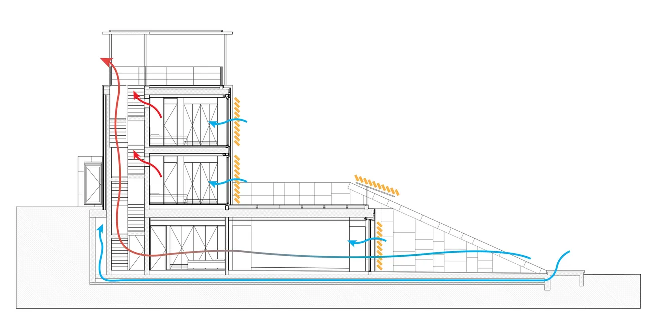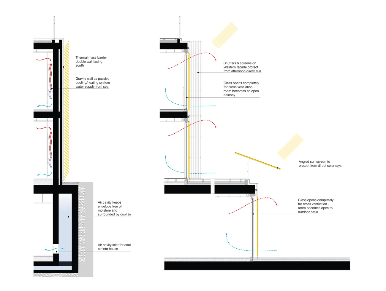 The combination of the courtyard and tower produces a new house typology. The strategy of the court tower is enhanced by the systems and materials used to build it. A heat-exchanger system is used in the house to cool down the rooms. This gravivent system is supplied by a heat exchanger using cool seawater on the primary side. The gravity driven system is integrated into the closet design of the bedrooms. An air handling unit provides fresh air for the rooms when no natural ventilation is possible. An earth duct is used to pre-condition the outside air before entering the AHU. The double concrete block walls are clad with light colored local stone and the windows have wood shutters to protect them from sun and to reduce radiant heat gain. These wood shutters also create an air cushion that further protects the windows from heat. A canvas canopy along the western façade delays the entry of direct sunlight into the house until late afternoon and creates an air spoiler effect above the main house façade.