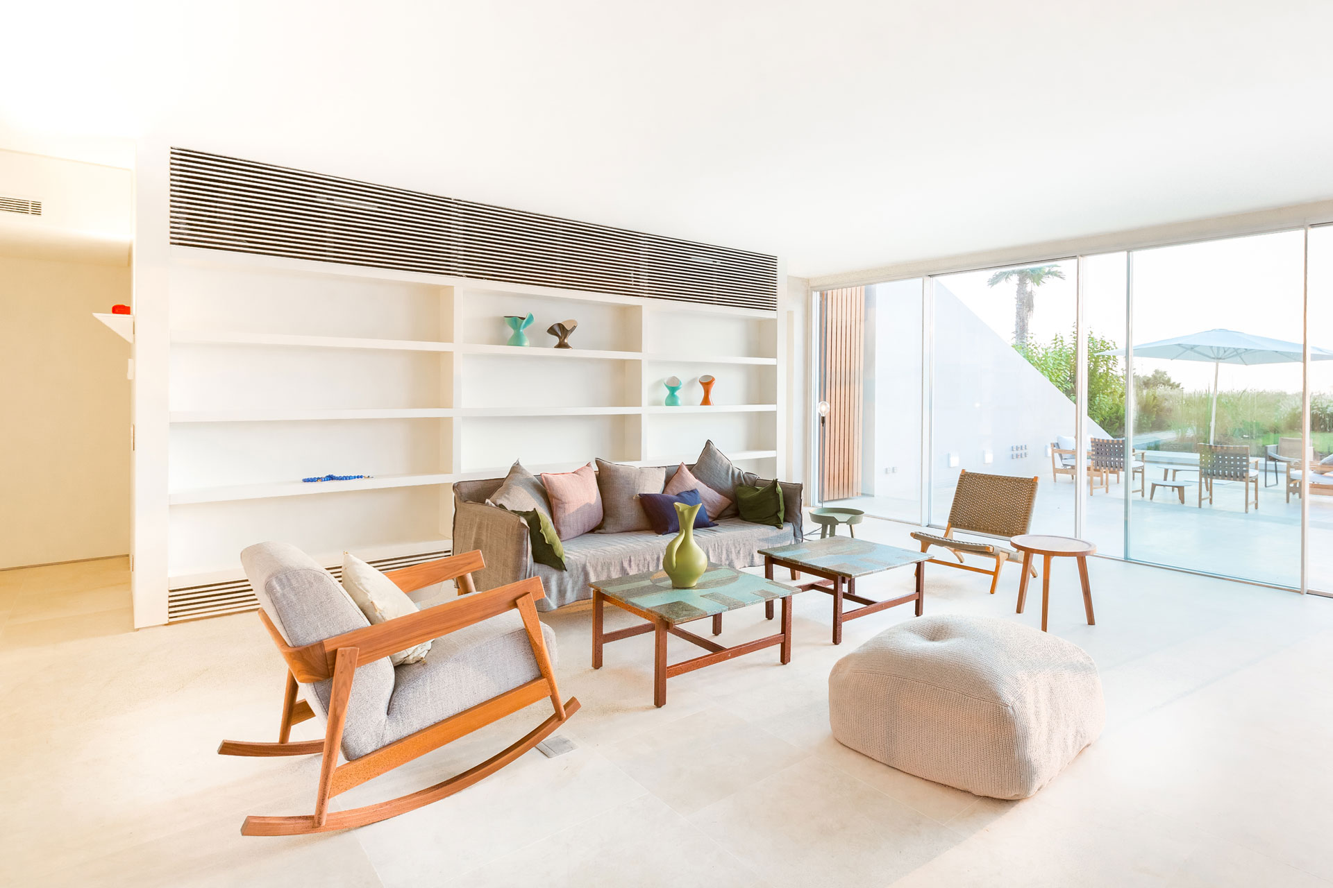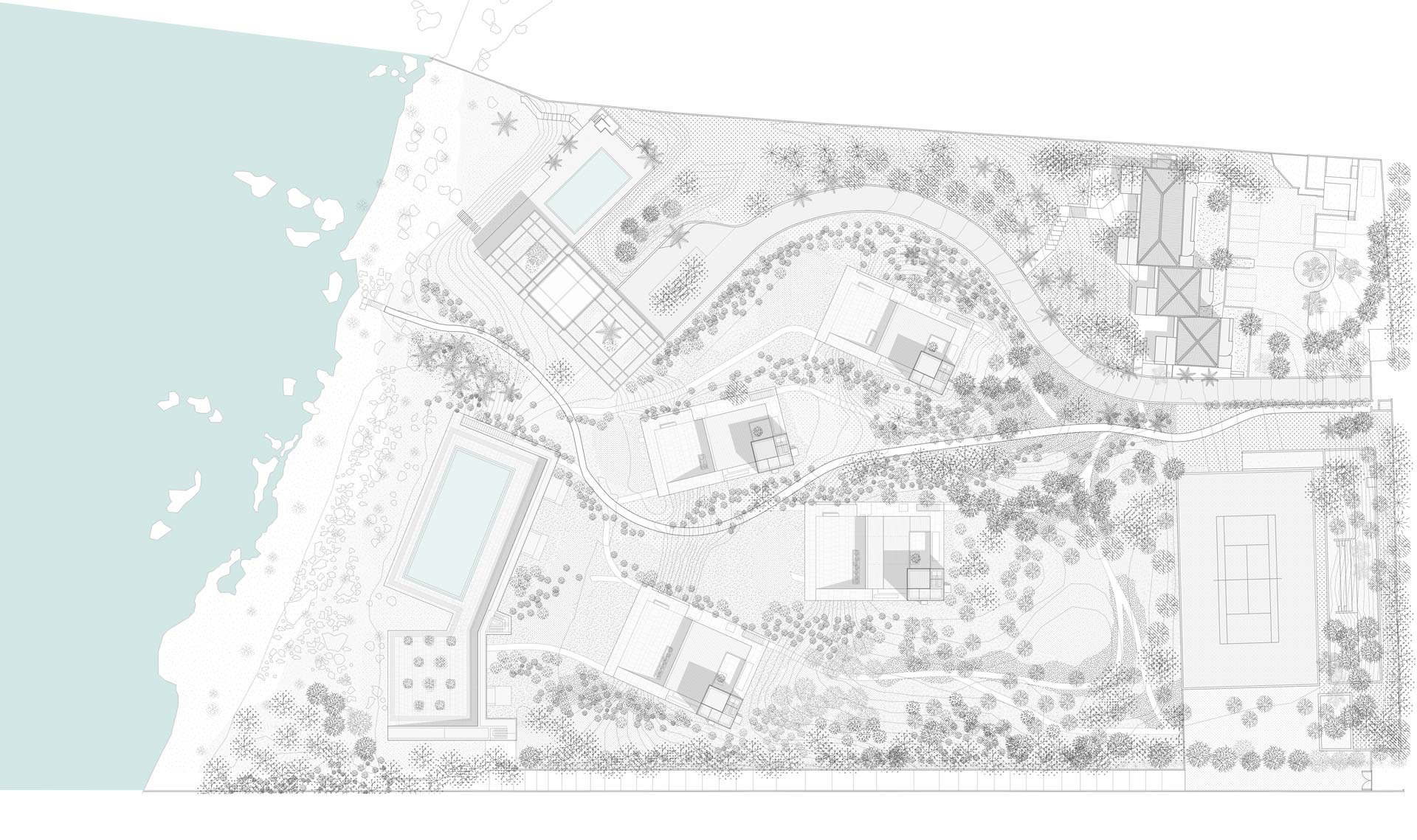 Four high-comfort single-family homes were built on the coast of Aamchit. The site slopes west towards the Mediterranean, allowing the houses to be embedded in the landscape. The front of the house is open to the view and breeze while the other sides are protected by earth. A multi-function double layer wall insulates and protects against the cold, moist soil while also housing building services and acting as an air intake to cool and distribute incoming fresh air. A courtyard in the back enhances cross ventilation and creates a microclimate in the extreme days of summer and winter.
