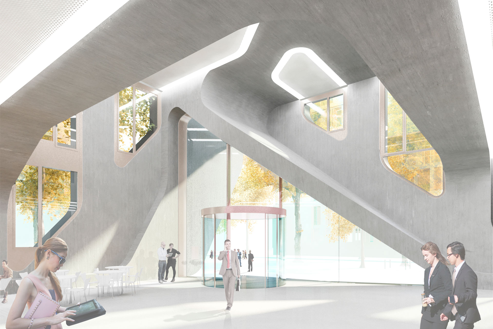 The FOM University of Economics & Management offers academic training opportunities in 31 locations. Under the helm of the FOM University of Applied Sciences, the BCW (BildungsCentrum der Wirtschaft) is planning a new university building in Berlin's Charlottenburg-Wilmersdorf district near the Tiergarten – in accordance with the design plans of the architecture firm J. MAYER H. and Partners. The building's five floors house a foyer with cafeteria, lecture halls, seminar rooms, administrative offices, library / reading room and group room. Underground parking is located in the basement, in addition to technical areas. The monolithic building envelope, interrupted by generously glazed windows, is the main characteristic of the building as well as the formative and identity-creating architecture. The windows are conceived as a 2-shell construction of box windows. They are of course ventilated by means of permanent openings and sealed off floor by floor. The box windows take on the motor-driven sunscreen. The inner primary façade can be opened manually. Using lightweight concrete, there is no core insulation in the opaque façade components. The objective is the development of a high-quality building with innovative, structural measures, minimized and efficient building technology with good user comfort and low energy requirements. On all levels, a cavity floor with regularly arranged maintenance openings provides the necessary flexibility with regard to changes in usage units, room layouts and media distribution. The comfort concept uses the thermally activated component mass in the foyer floor or in the exposed, massive ceiling areas of the main usable areas. Thermally highly loaded seminar rooms and lecture halls also have acoustically effective cooling ceiling panels. Additional heat loads are dissipated convectively via ground-integrated fan coils. The entire building is mechanically ventilated; the air change rates are adjusted according to CO₂ requirements. The heat supply is provided by the district heating network of Berlin. Wherever possible, the cooling requirements of the building are met by free, adiabatic cooling by means of re-cooling systems on the roof and by ventilation-integrated exhaust air humidification.