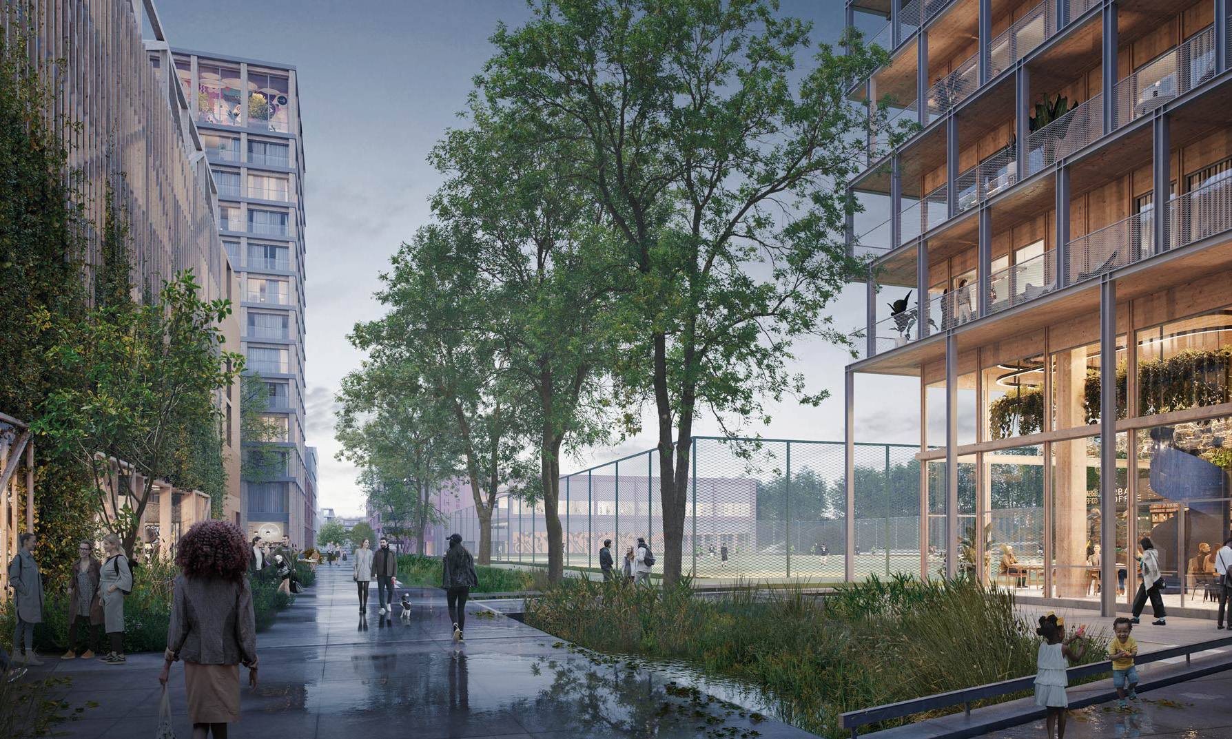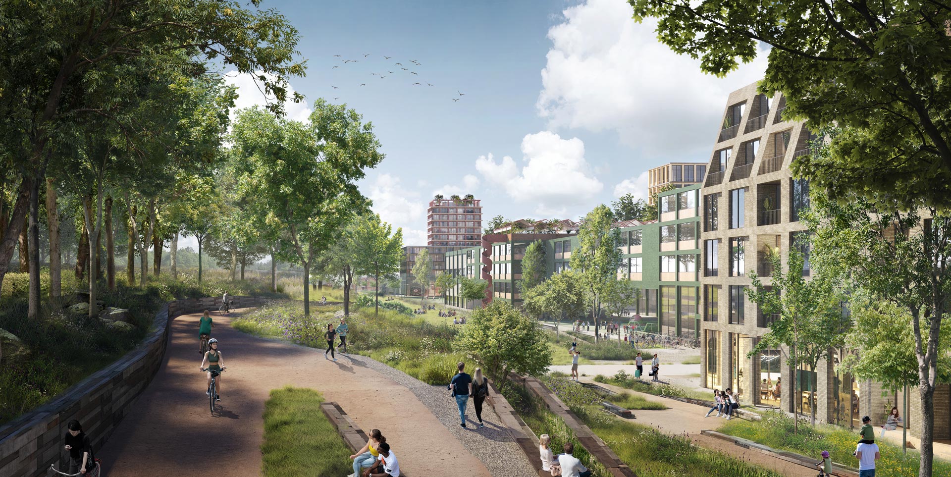 Described as a “contemporary interpretation of urban life,” the district is inspired by the classic block structure of European cities. However, it aims to create a pedestrian-friendly quarter where social infrastructure is safely accessible on foot and by bike. The new quarter's public spaces form a network of green areas that connect both sides of the station. The dyke park along the tracks is not a traditional park but a space where ecology and urban life intersect, offering an urban wilderness landscape and providing sound insulation from the railroad.