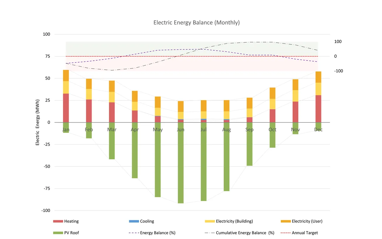 Using dynamic simulations, Transsolar calculated hourly energy demands for heating, cooling, and electricity, summarized as monthly balances. If half the roof area is covered with photovoltaics, the neighborhood can generate approximately 45% more than the annual building energy demand. With user electricity, the energy generated on site is still around 19% higher. This surplus energy is used to offset the buildings' grey energy, making the neighborhood truly sustainable.