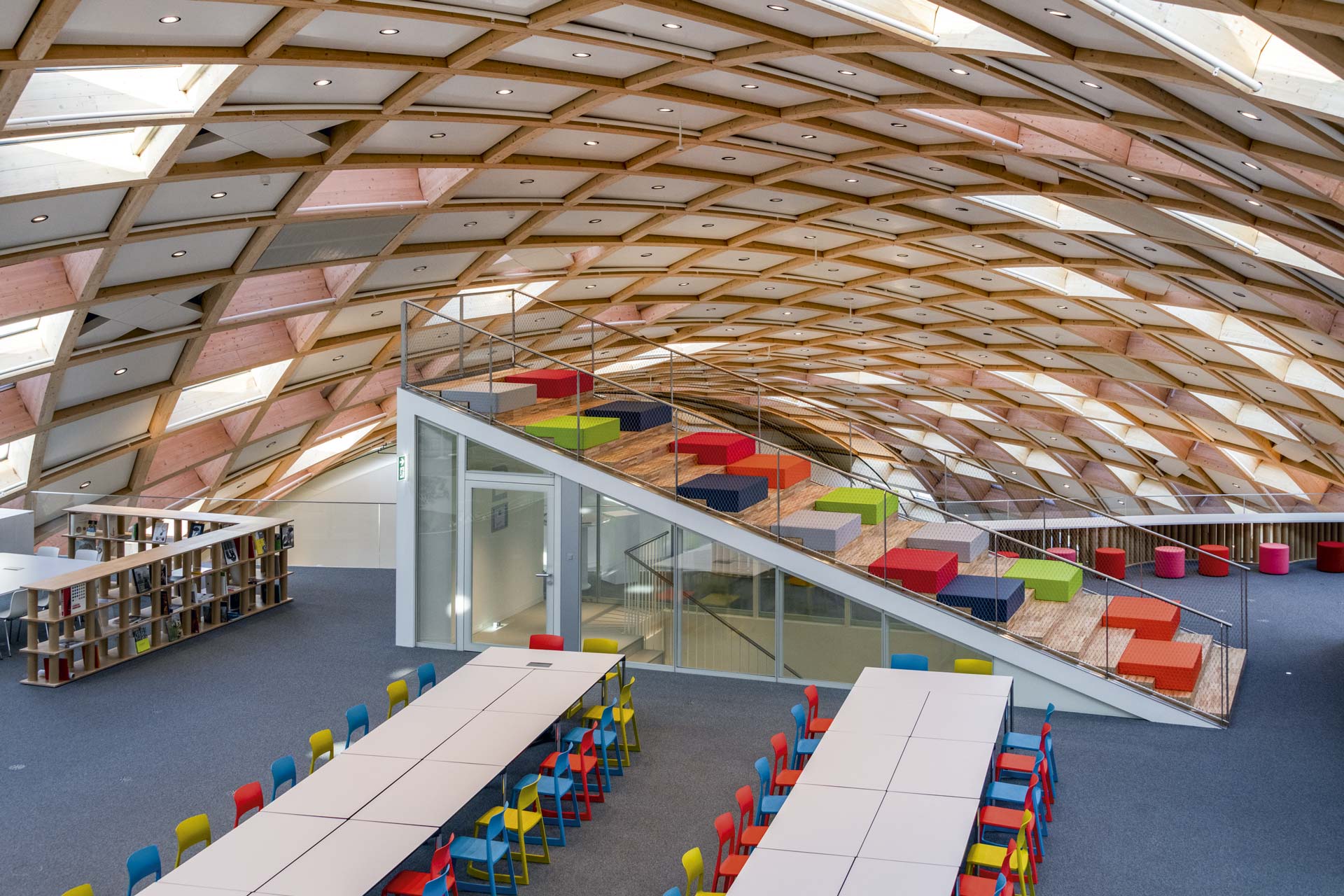 With 1,997 m³ / 70,523 ft³ of indigenous spruce timber, this campus is one of the largest hybrid timber constructions. The three buildings - the Swatch Headquarters, the Omega Factory and the Museum Cité du Temps – are speaking a uniform design language: they share a common material palette and environmental awareness. Each strategy implemented in the project is designed to minimize global impact and serve as a model for future buildings. To achieve an energy-efficient, comfortable working environment, radiant cooling and heating with activated ceiling panels or water pipes embedded in the concrete ceilings are used. The campus uses the regenerative energy potential of groundwater from wells: for heating, heat pumps "collect" the relative heat of the water from the subsurface. The heat itself is free of charge, only the heat pumps need electricity for operation but deliver considerably more energy than they need for operation. When cooling is required, the groundwater is cold enough to lower the temperature in the cooling circuit of the radiant cooling system via heat exchangers: operation in summer does not require heat pumps. Thus, in addition to the heat, the cold is also regenerative and only takes the rather low amount of electrical energy for the pumping. All roofs carry PV modules on surfaces facing southeast or southwest and cover part of the electricity requirement.