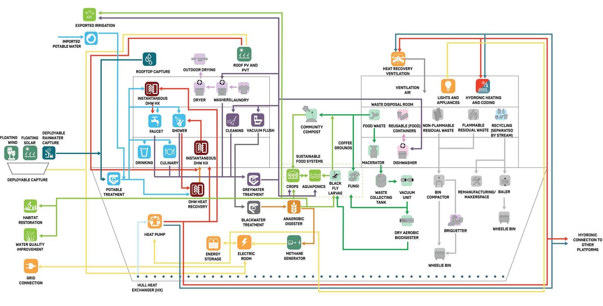 Efficient systems support the passive strategies and are highly integrated in the overall sustainability ecosystem of the platforms – for example, the energy use of closed-loop water treatment systems is considered in the overall energy balance, as is the energy generation potential of biogas from the water treatment process. Hydronic tubing integrated in the hull allows the platform itself to act as a giant closed-loop heat exchanger with the ocean for high-efficiency heating and cooling.