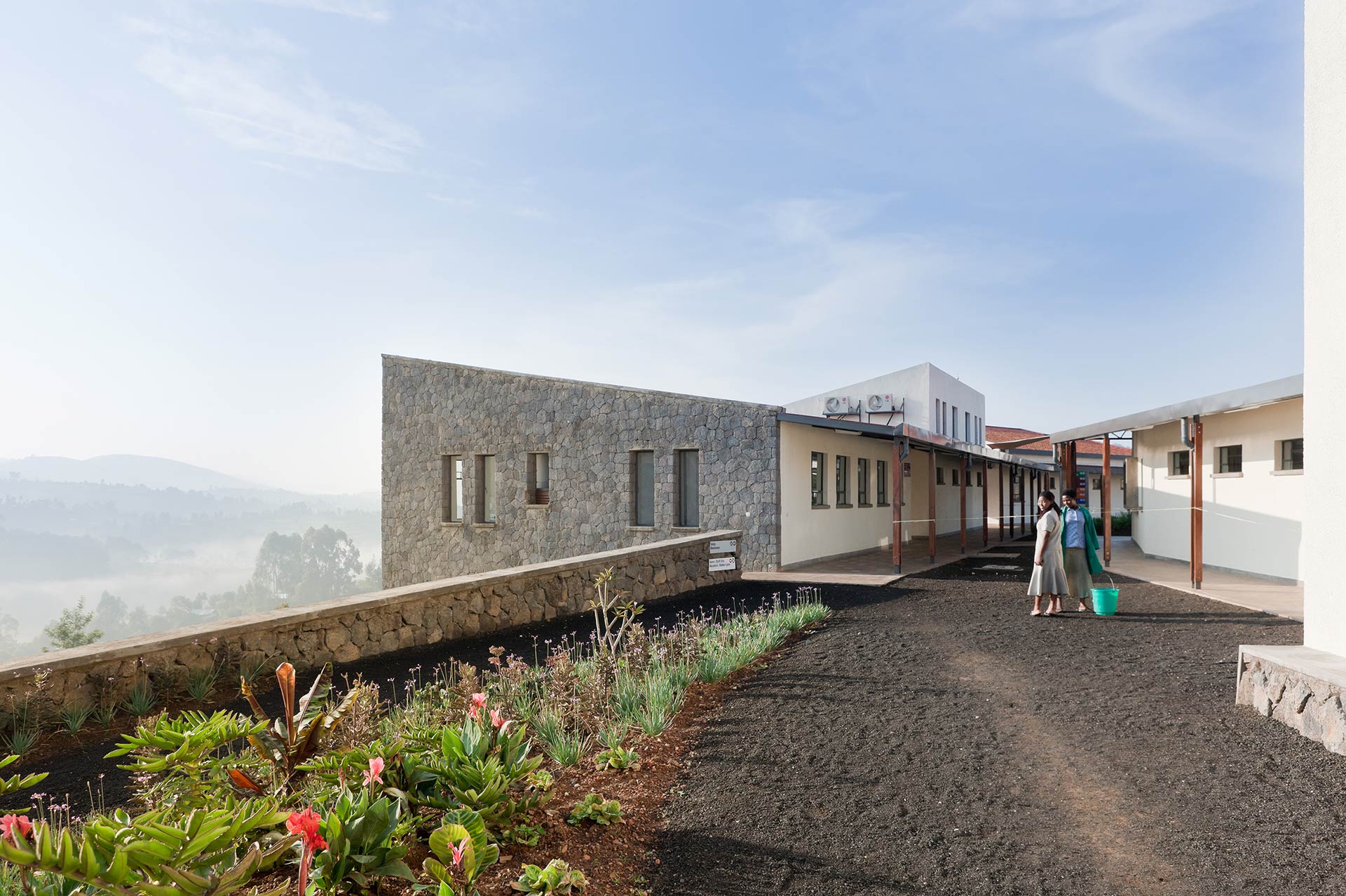 Clinical areas with high ceilings an large windows can meet the World Health Organization’s recommendation of 10 to 12 air changes per hour to provide good protection. The design and orientation of the hospital complex in Butaro were influenced by these guidelines. Sitting atop a hill, the buildings are optimized for cross ventilation, with the support of ceiling fans and vents. The protected exterior circulation space reduces contact between infected and non-infected peoples. In addition, ultraviolet germicidal lights were also installed in certain areas.
