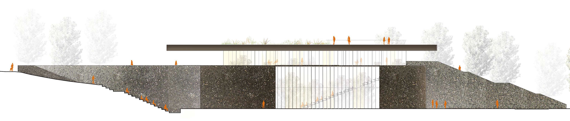 The multipurpose room is mechanically ventilated to offer maximum flexibility: it can serve as a gym with low occupancy; it can accommodate simultaneously up to two events; it allows up to 400 seats for a concert and it may be opened on to the adjacent landscape. Its facade facing the river is fully glazed, and furnished with an exterior wooden sunscreen and an interior curtain. Openings in the facade allow natural ventilation in the shoulder seasons and in summer.