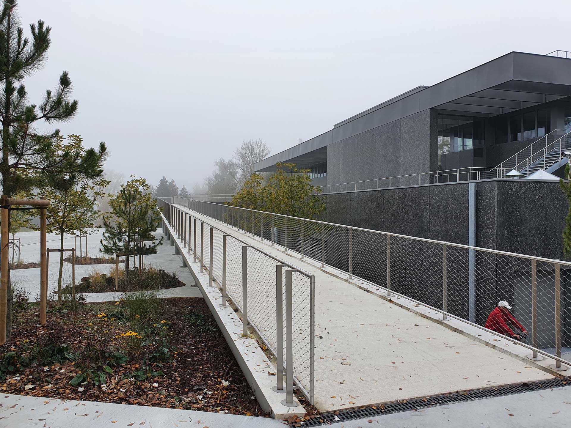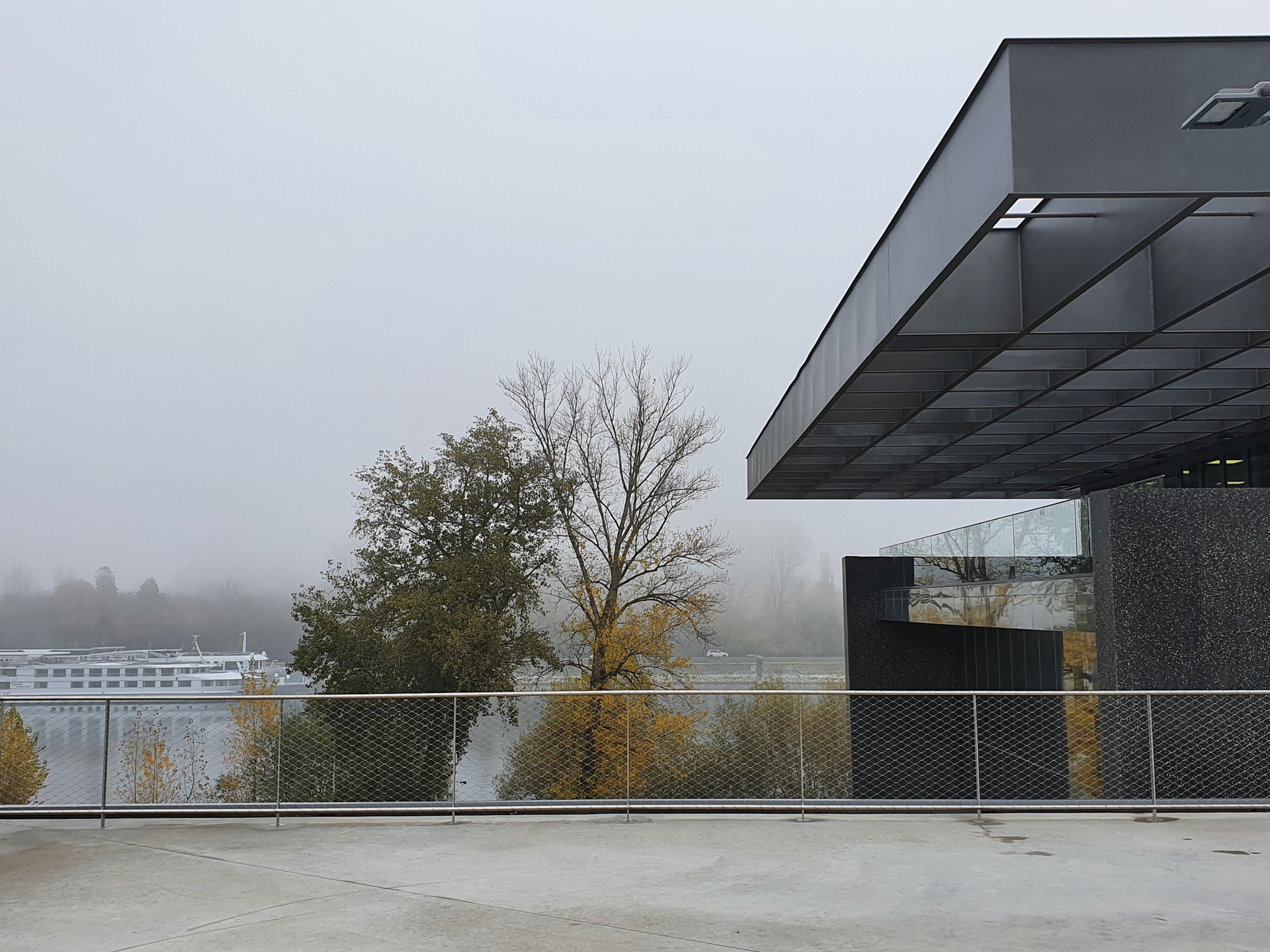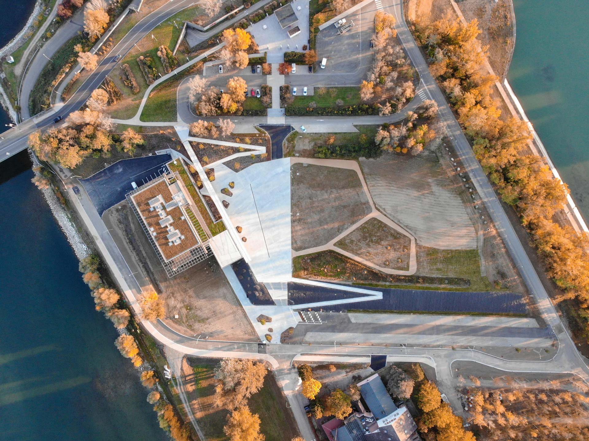 Vogelgrun is a French town located on the French-German border, and home to a new cultural centre. The centre, located on an island, possesses an architecture that takes advantage of the site’s geographical features: The large hall for 400 visitors is located close to the riverbank, and offers views to the Rhine and the rocks of Brisach on the opposite bank. In addition to the multi-purpose hall, there is a tourist office, a French-German cultural centre, a forecourt and an observation deck, which offers impressive views towards the two neighbouring towns and their surroundings. On the other hand, since the building is visible from afar, special care was taken with its form.