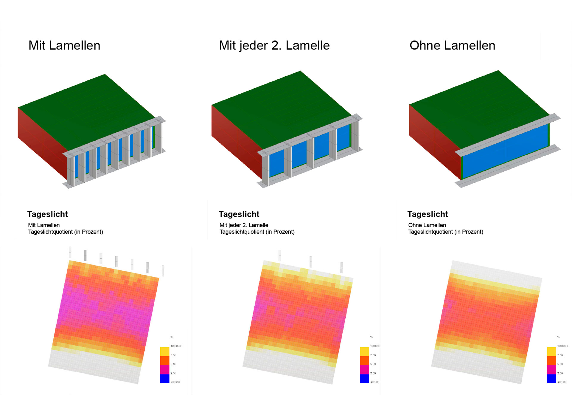 Due to the north-south orientation of the building cantilevers offer the possibility to ensure very good shading without additional external sun protection. Therefore, the roof overhangs were optimized in such a way that they provide sufficient shading on the one hand, but on the other hand also allow a lot of daylight to enter the office space. This iterative process was repeated several times in the planning team, so that an optimum was found. Daylight levels and thermal comfort have been evaluated in parallel using the software "Grasshopper".
