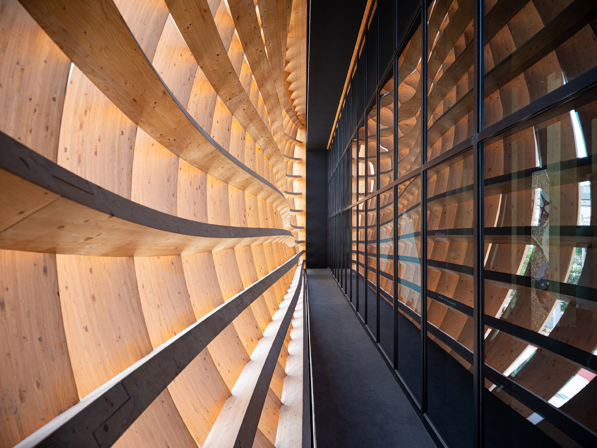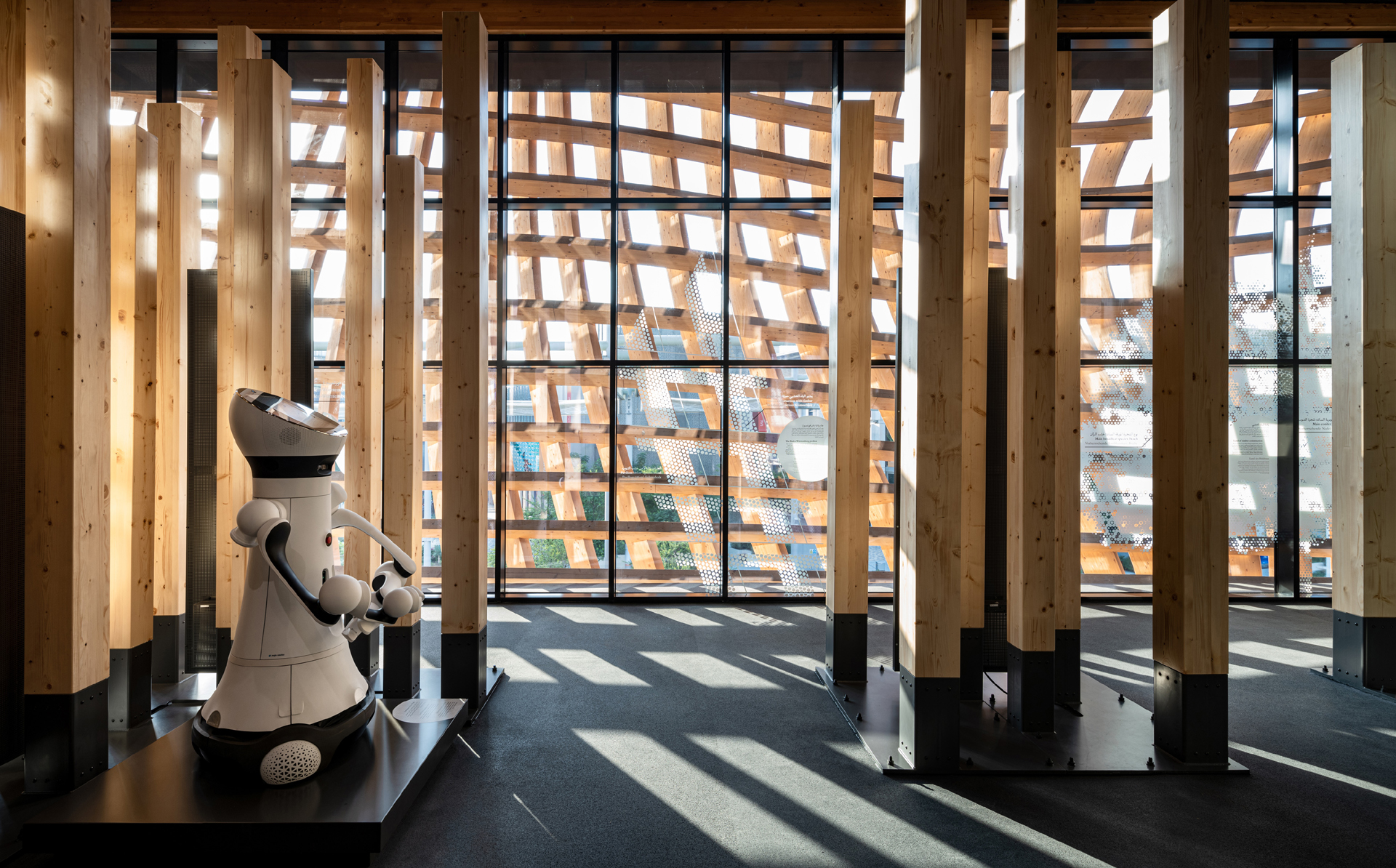 The curved glass and wood façade that dominates the pavilion's appearance was created in close collaboration between structural and façade planners Knippers Helbig and Transsolar to coordinate requirements for transparency and protection from morning sun. 500 square meters of roof-integrated PVT modules – hybrid thermal photovoltaic modules – form a rear-ventilated shading layer above the pavilion. They simultaneously cover the electrical energy demand for CO2-neutral conditioning of the entire pavilion and collect heat with the heat exchanger on the backside. This system heats the PV surfaces in the early morning hours preventing dew with dust particles settling on the modules, which would be burned in by the sun. The dust remains dry and is blown away by the wind or removed by a cleaning robot. A reduction in efficiency due to soiling is therefore significantly smaller; cleaning with valuable water is no longer necessary.