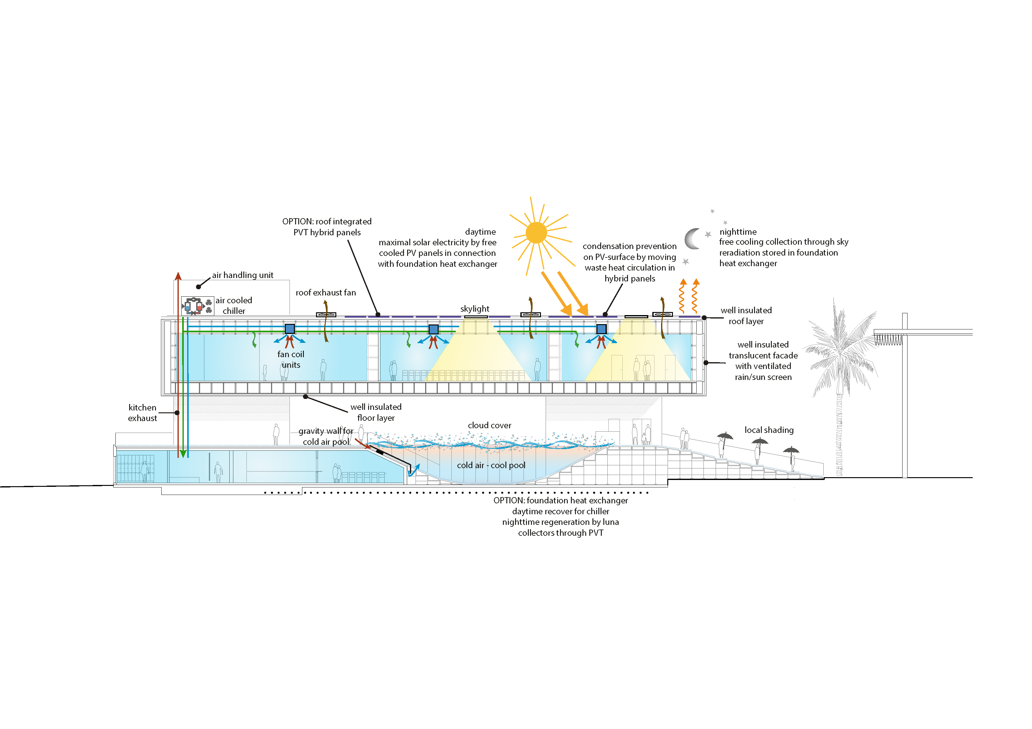 The PVT system on the roof regenerates this foundation heat exchanger at night with its thermal system. The heat absorbed in the “CoolPool” during the day is released to the night sky . Thus, the ground sink remains cool, with temperatures of 4 to 10 Kelvin far below those of the surroundings and offers Expo visitors a well-tempered shaded area as a resting zone - emission-free and energetically at zero cost.