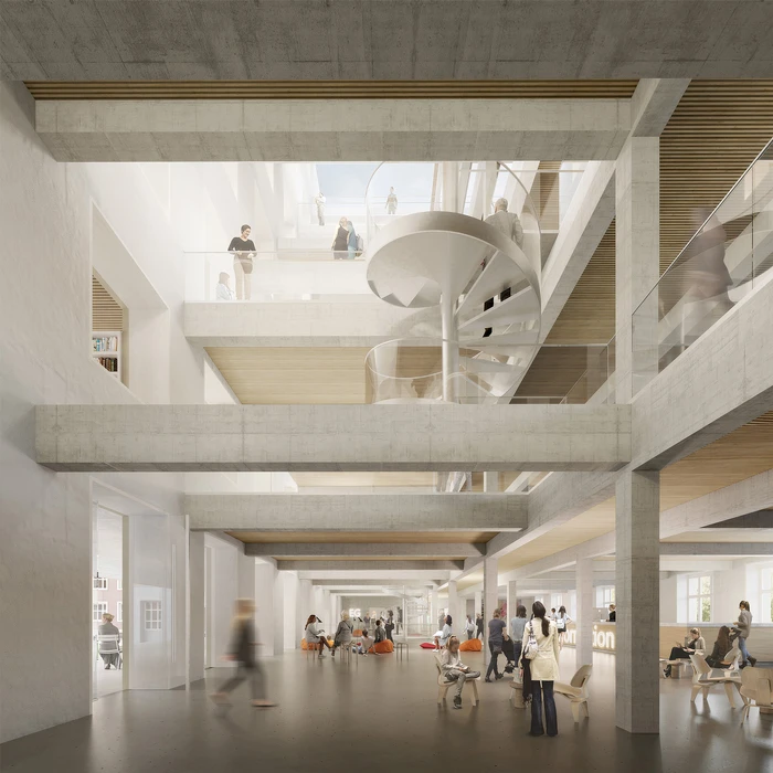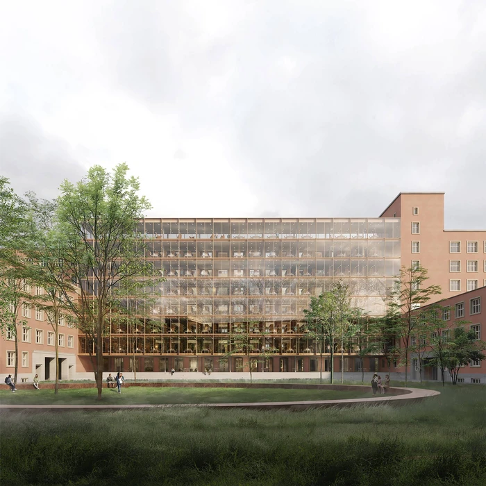 The new library will be adjacent to the existing structure, opening onto the courtyard. Thus, the large courtyard remains undeveloped and becomes a garden, accessible through passages in the north and south. Some ceilings of the existing structure will be removed, and new stairs will connect the eight floors of the "stacked" library. Formerly stacked Siemens offices will transform into new flowing spaces.