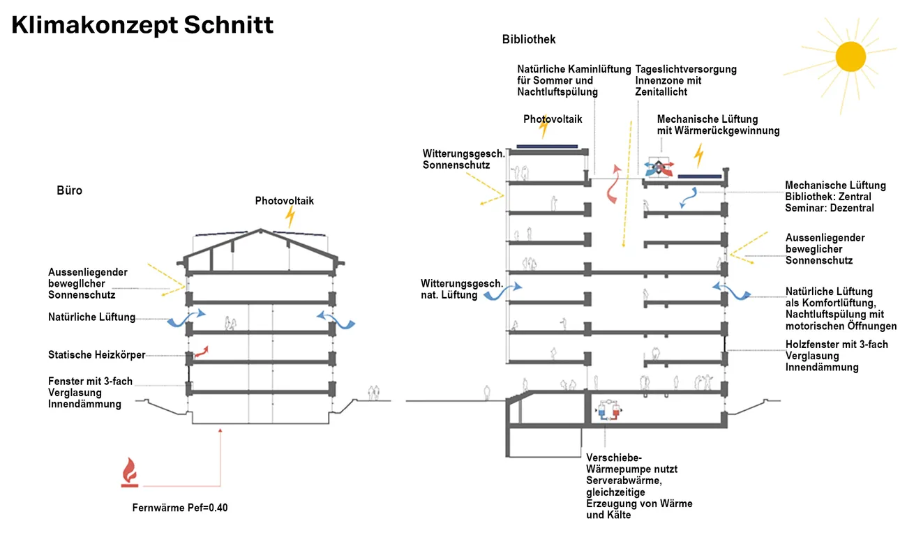 Decentralized units will provide fresh air to the seminar rooms, which can also actively precool. The amount of fresh air will adjust energy-efficiently to current occupancy, determined by measured air quality. The library will have mechanical ventilation, with the central system featuring highly efficient heat recovery. Fresh air can be cooled without needing refrigeration through adiabatic humidification of exhaust air. The offices for lecturers will have purely natural ventilation, with night ventilation and enhanced comfort in summer through ceiling fans.