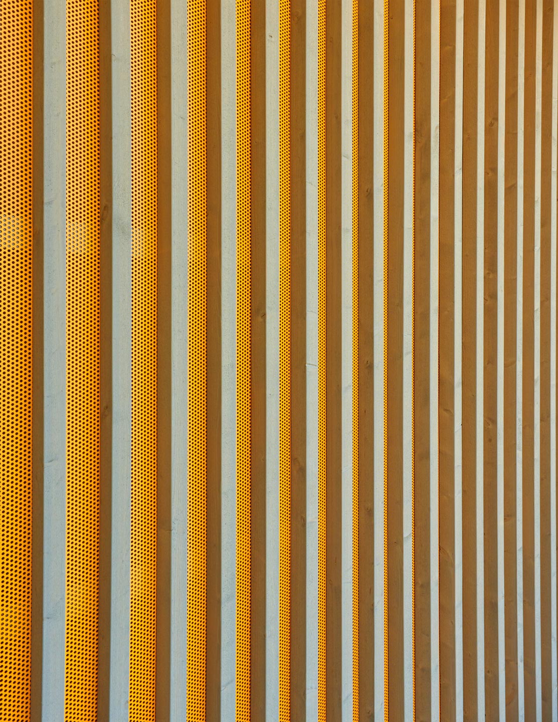 The classrooms and the teachers' large workrooms each have two decentralized ventilation units with heat recovery. They are integrated into the facades and supply the rooms with sufficient fresh air exclusively during the time of use. In the summer, the doors to the outdoor balcony in the classrooms can also be opened. The ventilation units ensure that the rooms and the concrete ceilings, which are 50% free, cool down during the nights.