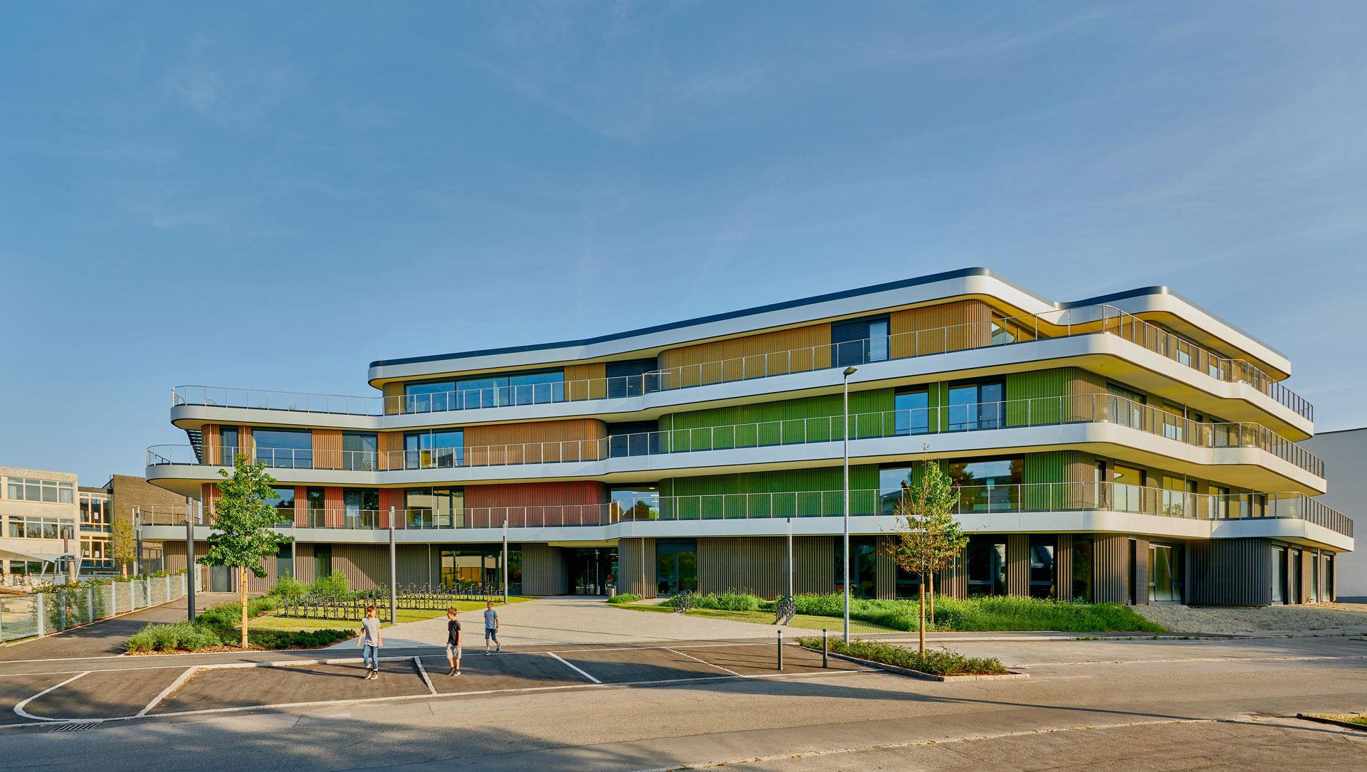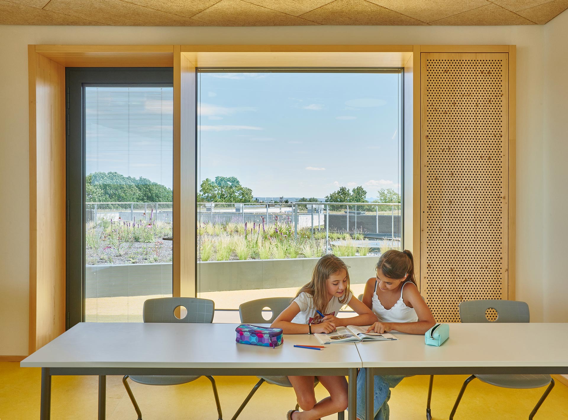 The school manages without mechanical cooling. Thanks to efficient solar shading and night cooling with air, comfortable room conditions are ensured even in summer.
