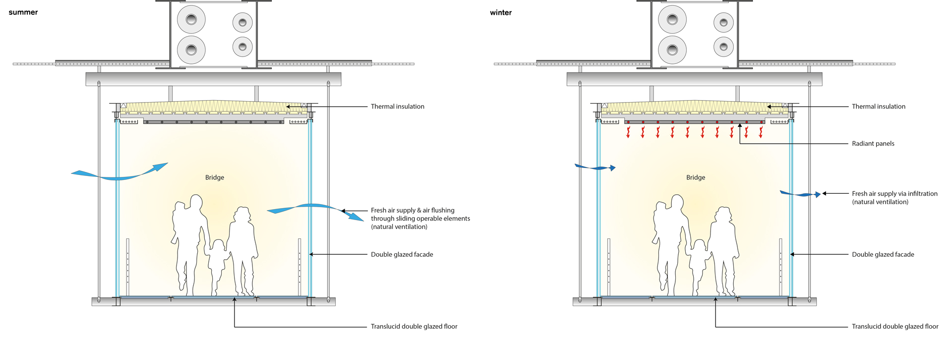 All facades are insulated using performant thermal insulation and triple glazing equipped with external operable solar protection. Only the bridges are an exception; they are double-glazed and protected from the sun by large overhangs, being passively ventilated, cooled, and heated. They rely solely on passive measures for climate control, except in extreme cold, when low-temperature radiant panels are used for heating.