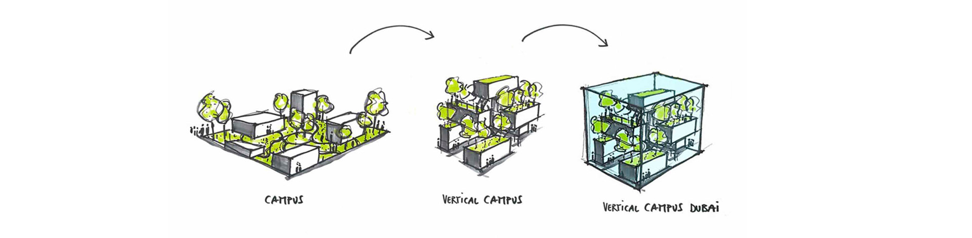 In the German Pavilion Expo 2021, visitors pass through a "vertical campus", an ensemble of buildings under a free-form roof. Between the cubes of the exhibition and classrooms, the terraces offer views over the diverse interior of the pavilion. The opaque trapezoidal roof reduces solar gains to a minimum but allows sunlight to flow through small openings in the surface structure into the open atrium. The focus of the design of this pavilion was on sustainability. Through a clever arrangement of architectural elements, the pavilion adapts to Dubai's climatic conditions. The well-calculated design guarantees a minimal use of resources and energy consumption.