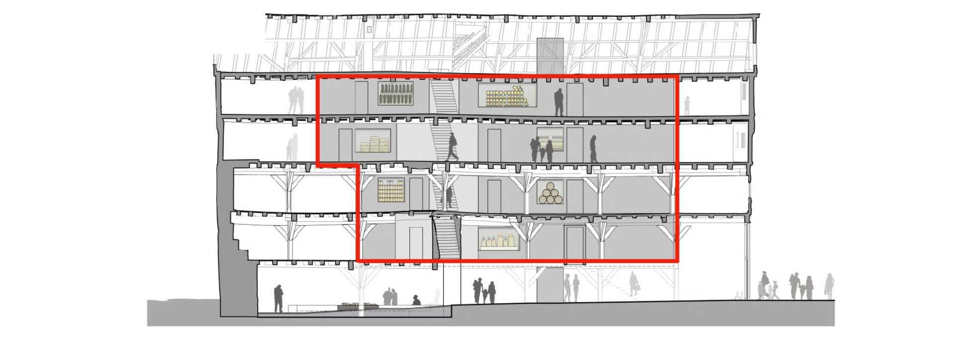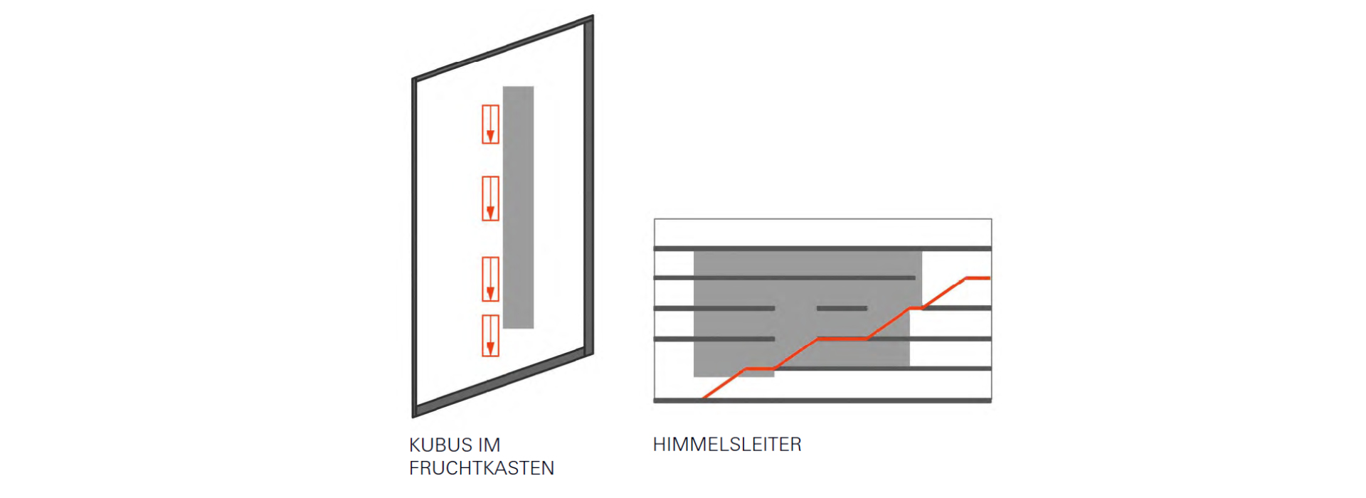 The basic structure of the historic construction is to be preserved. The interior will be designed in a large air compound, is to appear translucent and light and draw attention to the historic structure. Two new essential elements, the “cube” and the “sky ladder”, are deliberately added to provide a modern contrast. The cube will provide space for exhibits across all floors and act as a connecting element, as will the sky ladder. It will open up the “Fruchtkasten” along a visual axis from the lowest floor to the top under the roof.
