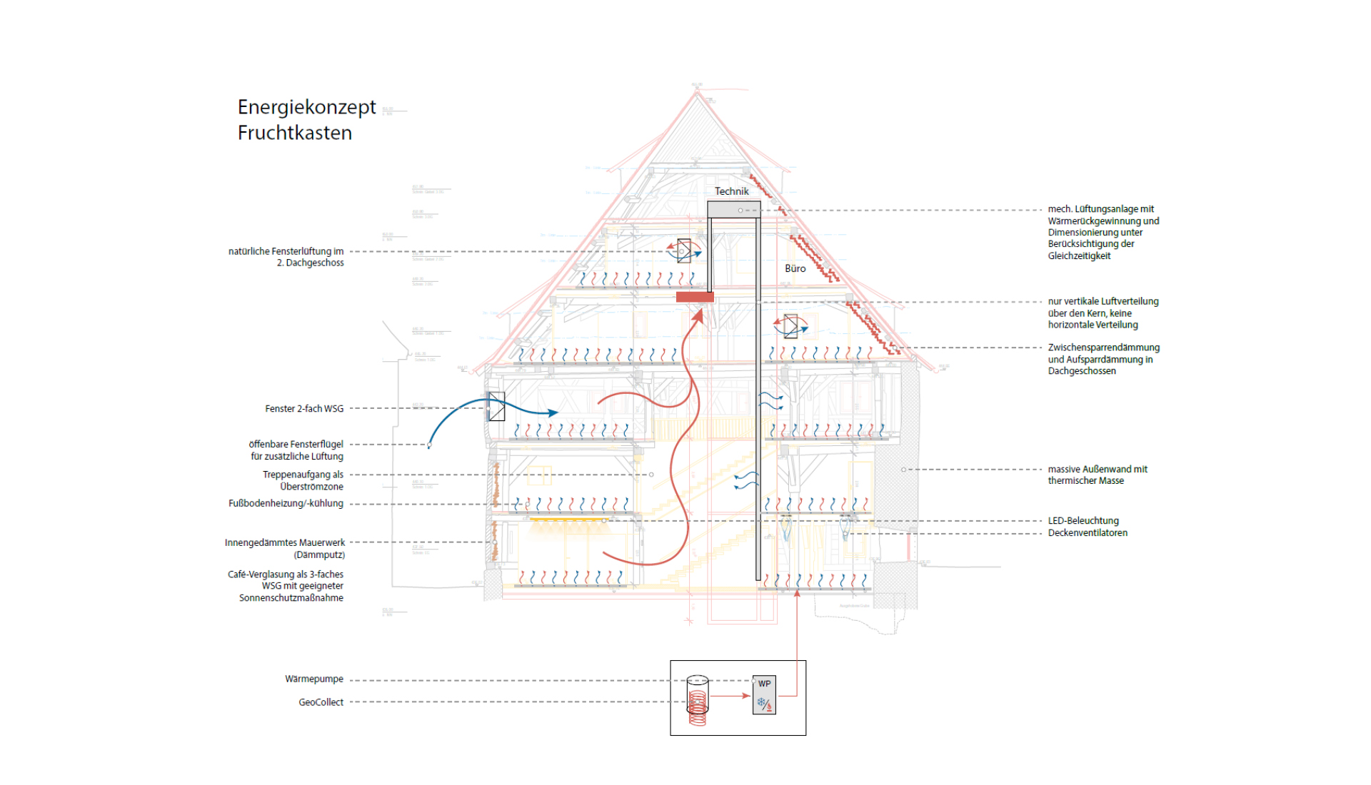 The retention of the historic building fabric is a high priority. At the same time, it is essential to avoid heat loss and to provide the necessary heating energy from renewable sources. The design strikes a sensible balance between these two requirements.
