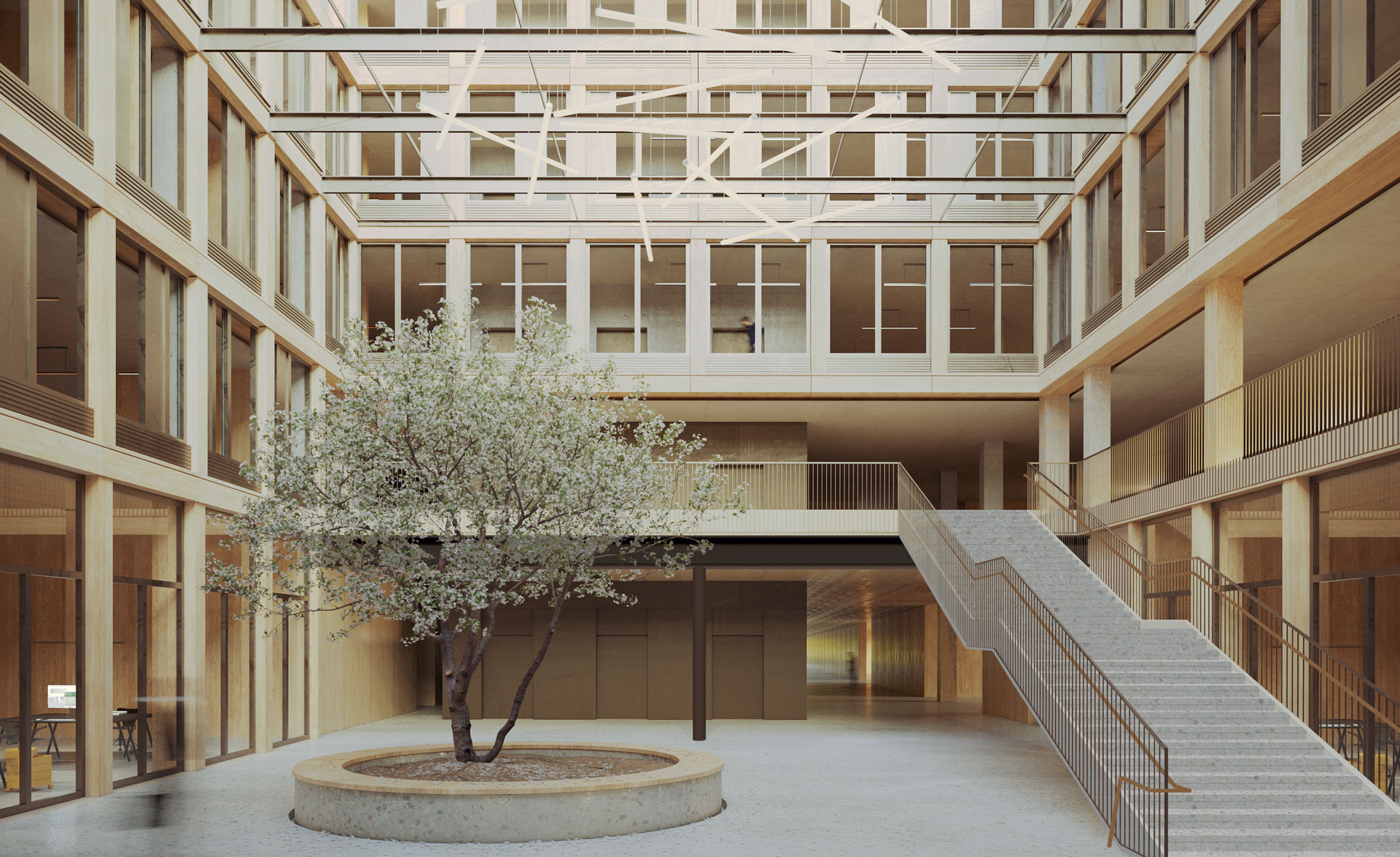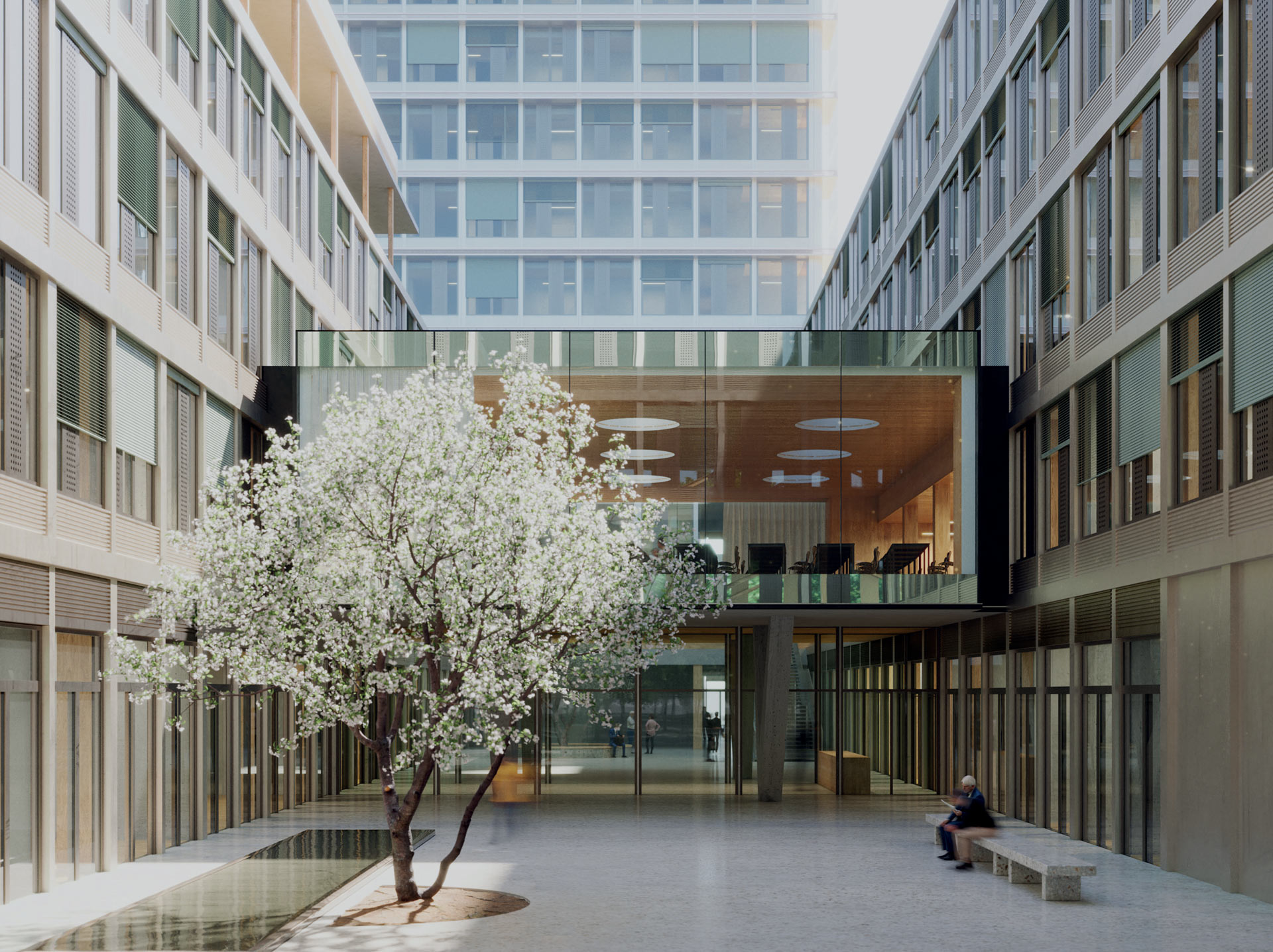The energy concept aims for a balanced CO2-neutrality, meaning the building must completely offset the CO2 emissions it produces during an operational year with locally sourced renewable energy, generated here through photovoltaics. The energy demand must be kept as low as possible, and the team will use passive strategies and exploit synergies to achieve this. Based on simulations using the extreme weather dataset provided by the German Weather Service (DWD), Transsolar examined usage areas concerning comfort and energy demand, developed a concept for high thermal comfort and maximum flexibility for each area, and tested for maximum robustness. Passive measures include a compact building form and high insulation standards for the façade. The glazing will be designed to optimally combine daylight availability with thermal protection in both summer and winter. External slatted shading lets in sufficient light thanks to individually adjustable daylight control while simultaneously reducing solar heat gain and, therefore, the cooling demand. A double façade surrounds the high-rise, shielding it from wind and weather while also dampening external noise, even with windows open, supporting prolonged natural ventilation. Adequate air exchange and good air quality by low-tech, low technical effort and low energy demand, are key elements of the concept. Energy efficiency is enhanced when the ventilation system and conditioning are technically separated. The flat-roofed building is designed with mechanical basic ventilation, with all areas that permit natural ventilation featuring operable windows. The high-rise will have basic ventilation via floor-by-floor dedicated ventilation systems with heat recovery. Outside air is centrally drawn in, and exhaust air is expelled through another central duct.
