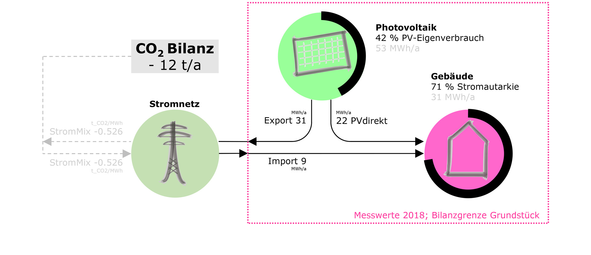 The low-tech climate concept, in conjunction with its efficiency and local, regenerative energy generation, achieves a positive annual balance. This means, on an annual average, the building generates more energy than it consumes.