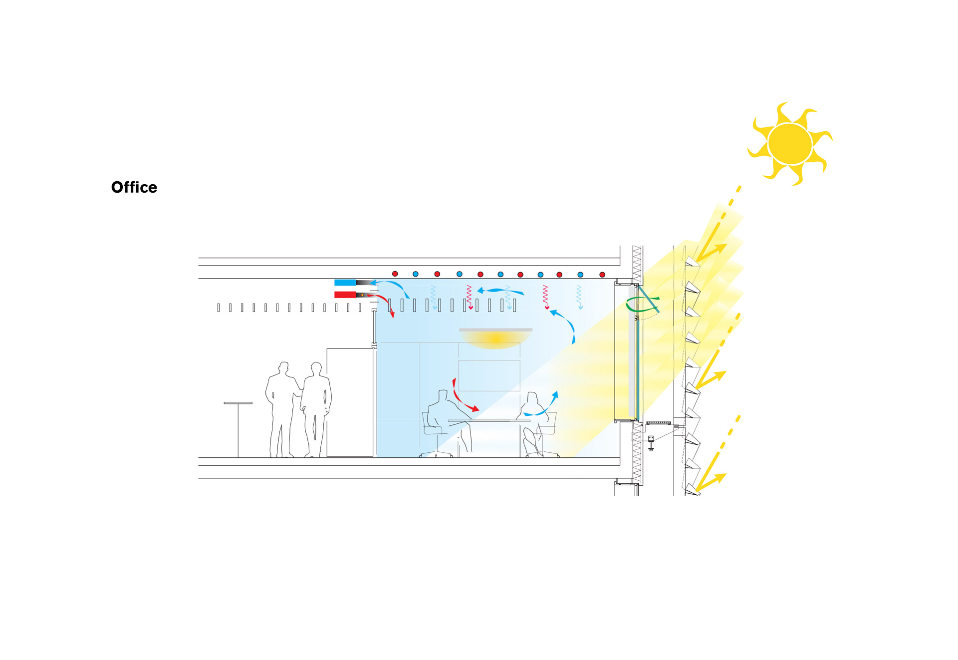 The heating and the cooling of both the offices and work areas are provided by the component activation integrated in the concrete. The users of these rooms can individually control their climate in the room by means of a heating element on the air outlet and operable openings in the facade.