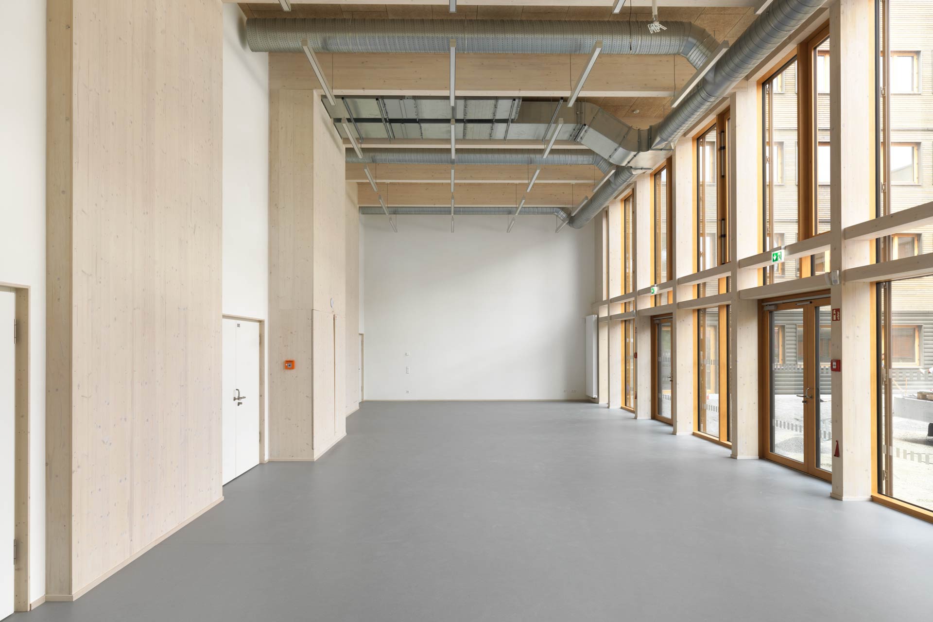 User control is provided for the external switchable sun and glare protection. The operable windows are primarily used for ventilation. Mechanical ventilation can be activated as required; in the class and group rooms, it ensures a healthy learning environment as required thanks to a CO2-dependent control. Since the fresh air enters the rooms via low-pulse displacement ventilation, ventilation is always comfortable.