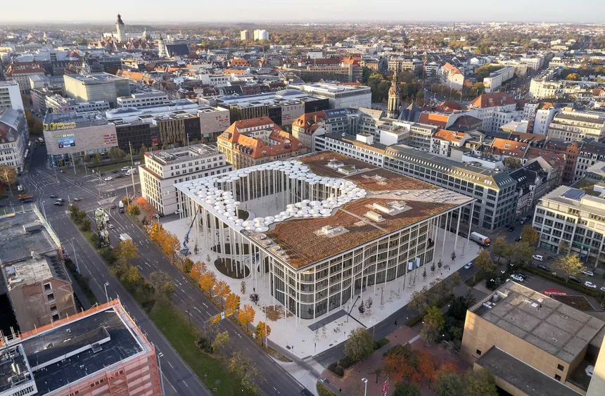 The SAB has built its new headquarters in Leipzig following the design of acme, the winner of a closed realization competition with a preliminary application procedure. One of the building's characteristic features is the “Forum,” a public courtyard equipped with many building-high, slender spun-concrete columns.