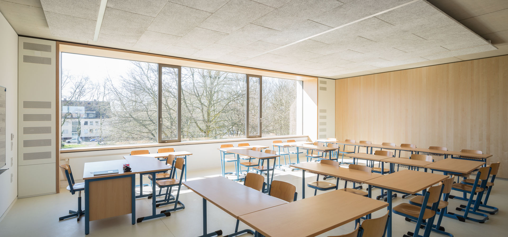 The lighting concept is energy-conscious as well: Intensive studies on daylight values in advance characterized the planning. With presence detectors and daylight-dependent controls as well as large windows with low parapets, supplemented by skylights and LEDs for sufficient lighting, the solution for building operation is optimal. Cost-effective lightweight panels made of excelsior are used as ceiling sails in the classrooms to ensure good acoustics. They require less space than, for example, gypsum plasterboard and thus allow more thermal storage mass to remain due to non-suspended ceiling areas.