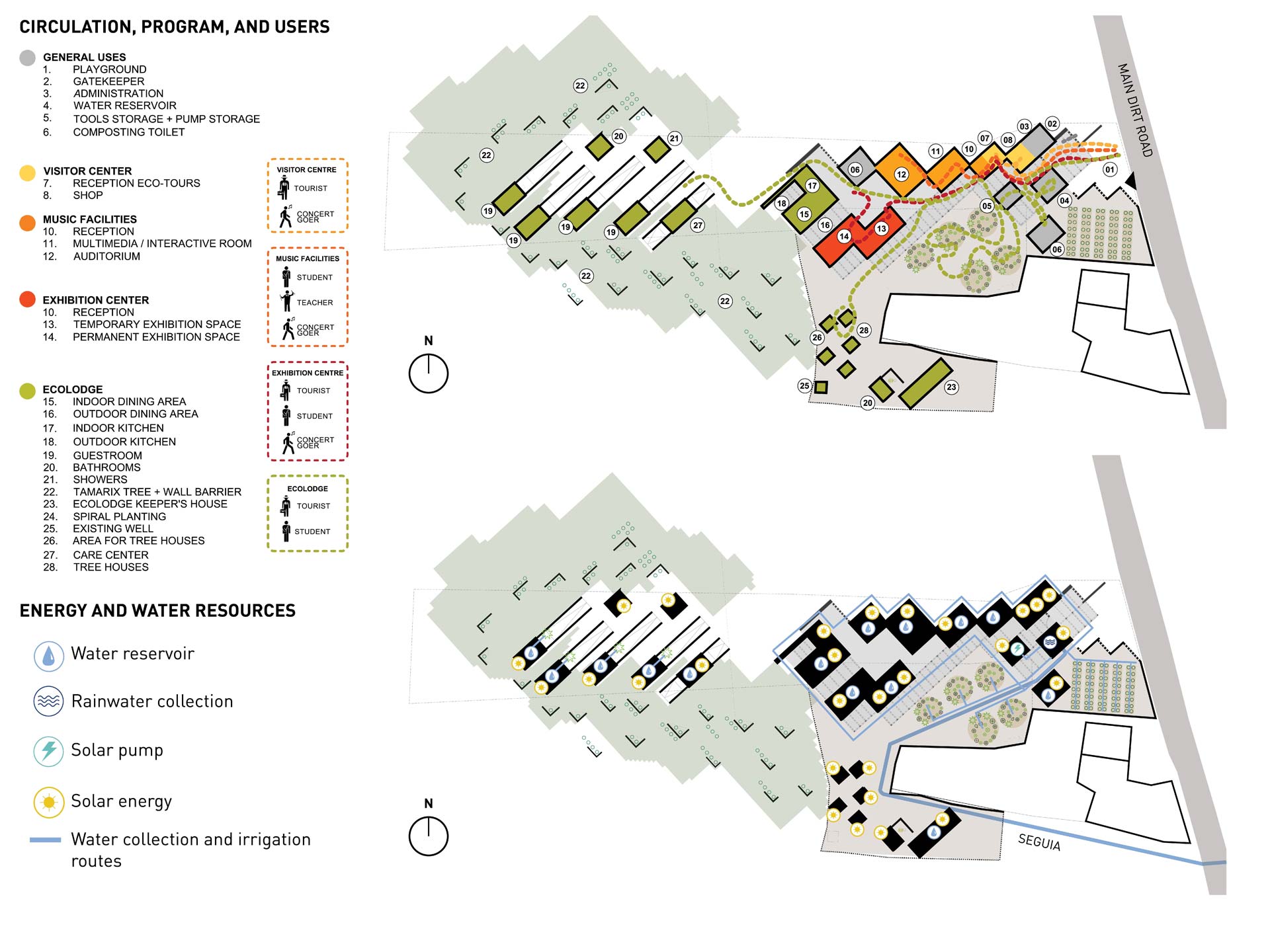 Facilities such as compost toilets streamline waste output and minimize environmental footprint. The use of natural building materials including rammed earth, palm tree trunks, and arish (thatched palm leaves) nearly eliminates CO2 emissions from the life cycle of these structures, with the exception of concrete which is sparring used in the water reservoir.