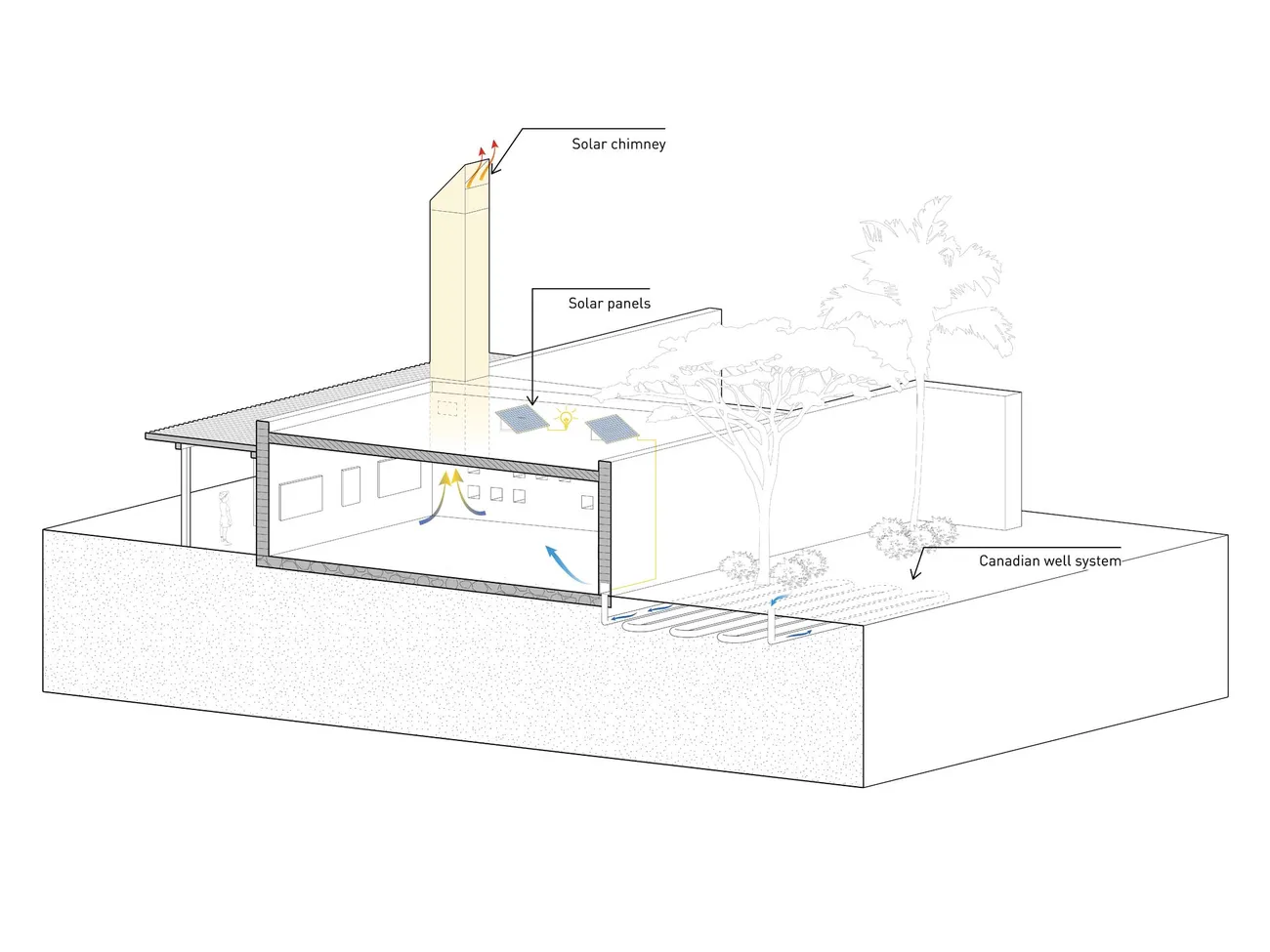 Due to the off-grid nature of the site and the efficacy of solar panels in our sunny region, the centre will be completely reliant upon photovoltaic solar panels for its energy consumption. The thermal mass of buildings with 80 cm rammed earth walls volumes provides passive thermal control by absorbing heat during daylight hours (cooling) and releasing it at night (heating). Temperature can drop significantly in the desert, nearing 1oC in the month of January. Windows, placed facing each other to promote cross-ventilation, are placed strategically to limit solar gain and are kept small, not exceeding 30 cm in width and are equipped with wood shutters with louvers, which can be modulated depending on the season and time of day. Further to the shutters, windows have mosquito nests. From May until September when night temperatures are high (25 - 28oC), the louvers of the shutters and the doors of all buildings will be left opened at night to allow for the flushing of the heat released by the rammed earth walls. Solar gain from the roof is limited by the use of a traditional roof composed of a 10-12 cm layer of clay and hay and 5 layers of woven reeds. Mechanical systems are kept to a minimum, with buildings relying on solar panels for energy, a solar-powered water pump for water distribution and 5 solar powered air extractors for the classrooms (one each) and the recording studio (2). Classrooms employ a passive cooling system which consists of solar chimneys combined with a double ceiling and a Canadian well system which supplements natural ventilation with cooled air.