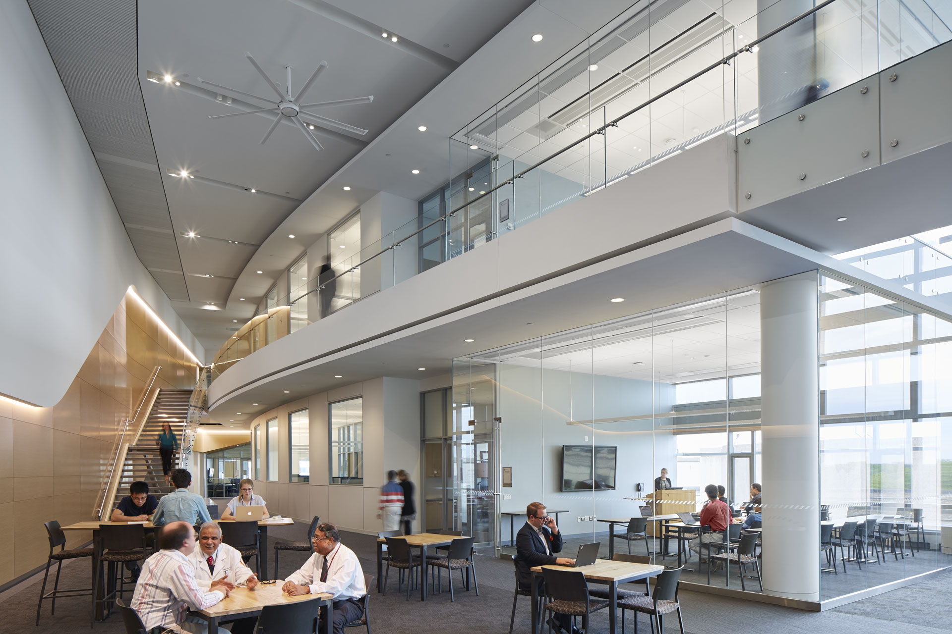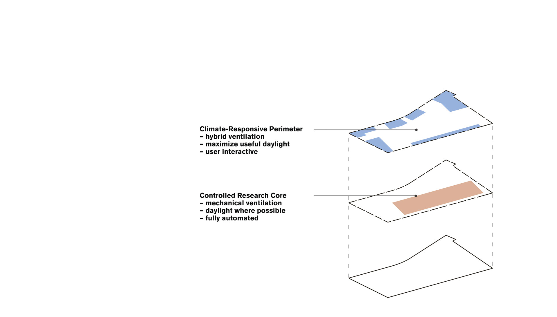 Transsolar developed the energy-efficient occupant-centric comfort concepts, ensured successful architectural integration of the overall concept, and performed daylight and advanced thermal simulations to tune comfort performance of the proposed architectural and low-energy mechanical climate control systems. Laboratory spaces with stringent climate control requirements are surrounded by spaces with relaxed climatic requirements - such as office and collaboration spaces - which are more capable of interacting with the exterior environment. This way all building occupants are able to control their relationship with the exterior - and thus their personal comfort - to the greatest extent possible. Floor plans and façade are tuned to allow daylight into nearly all regularly occupied spaces while solar heat gain is controlled. Detailed engineering studies helped develop an architecturally integrated natural cross-ventilation strategy for the offices, collaboration atrium, and auditorium by connecting the air flow path from façade openings to the atrium exhaust. Multiple strategies help minimize energy use of the laboratories: air cascade from separated write-up spaces, demand-responsive ventilation rates, runaround heat recovery, and local chilled beams for cooling. Transsolar also developed the conceptual design of the energy supply and recovery system, and coordinated detailed load and energy calculations with the MEP engineers to ensure that the energy performance expectations were consistent between all team members.