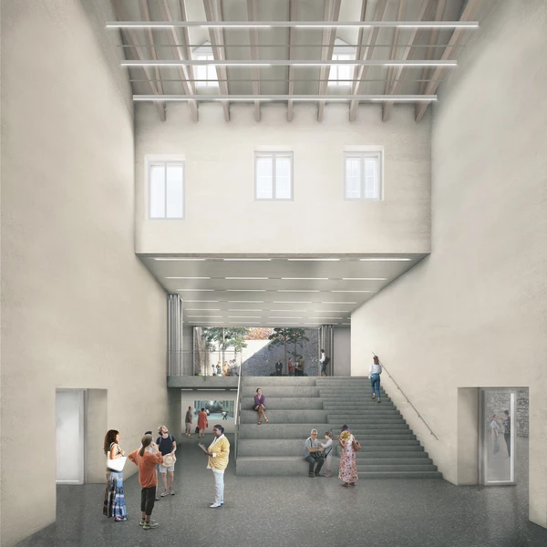 In 2021, PHI launched an International Architecture Competition for the design of PHI Contemporary. Transsolar was part of the winning design, led by architect firms Kuehn Malvezzi and Pelletier de Fontenay. Together with the design team, Transsolar established the appropriate climate conditions for each key part of the building based on programmatic needs. The central public forum offers a "mid-door" experience—an intermediary space between indoors and outdoors—providing a tempered transition between the extremes of Montreal’s climate, from very cold winters to warm and humid summer days. This space is tempered by radiant floors. To preserve the existing historical exterior walls, interior hemp insulation is applied as a low embodied carbon material. This breathable wall system helps regulate temperature and humidity peaks naturally, supporting the overall mechanical strategy not only for conditioning but also for ventilation and dehumidification. When outdoor conditions are favorable, the public forum opens via a series of folding doors, seamlessly connecting the main street with the internal public courtyard. Most new Class A art galleries are located underground to minimize energy losses in winter, except for those in the above-ground mass timber addition. This volume is highly insulated and predominantly opaque, featuring a toothed roof with north-facing high-performance skylights that provide diffuse daylight to the galleries below. The remaining program space is dedicated to administrative functions and will be renovated with high-performance operable windows, allowing for extended periods of natural ventilation when outdoor conditions permit.