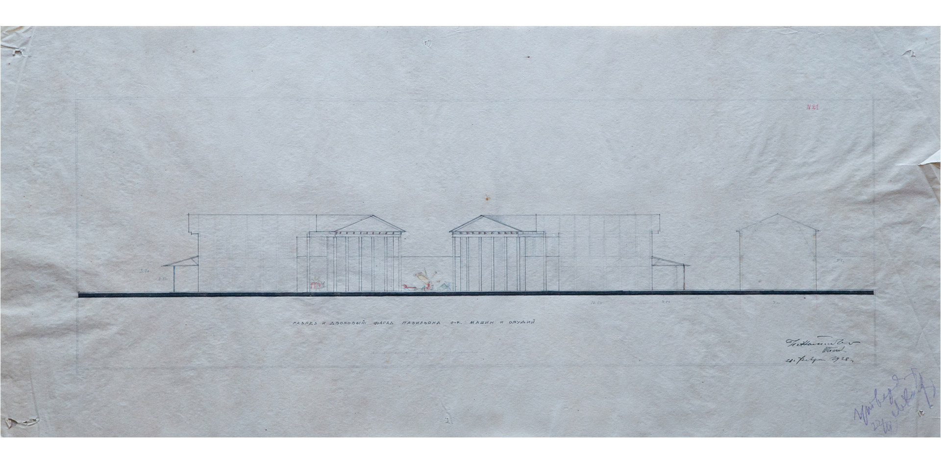 left: Ivan Zholtovsky and Mikhail Parusnikov, Working drawing for the Machines and Tools Pavilion. Part of the facade with wooden facing. Version, 1923
