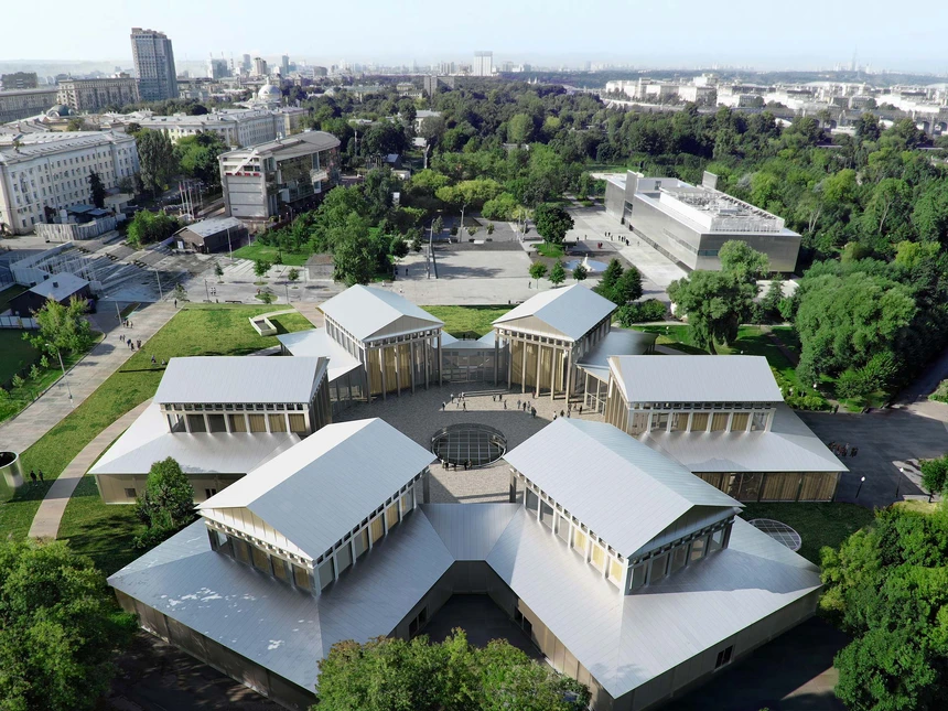 The Hexagon (Eng: hexagon, Russian: Shestigrannik) was designed for the First All-Russian Agricultural and Crafts Exhibition in Gorky Park in 1923 by architects Ivan Zholtovsky, Viktor Kokorin and Mikhail Parusnikov. The buildings were planned as open, unheated and uninsulated exhibition halls. After a complex foundation was laid in the marshy terrain, the 6 pavilions were erected within 1.5 months. The exhibition opened in August 1923 and closed only three months later in October. This was followed by changing uses and repeated reconstructions, in particular facades were bricked up. As one of the first Soviet reinforced concrete structures, the Hexagon is a listed building. After the end of the Soviet Union, the buildings were looted. Since a devastating fire, in which not only the wooden roofs were lost, only the skeleton of the reinforced concrete structure remained. The site has been closed to the public ever since.