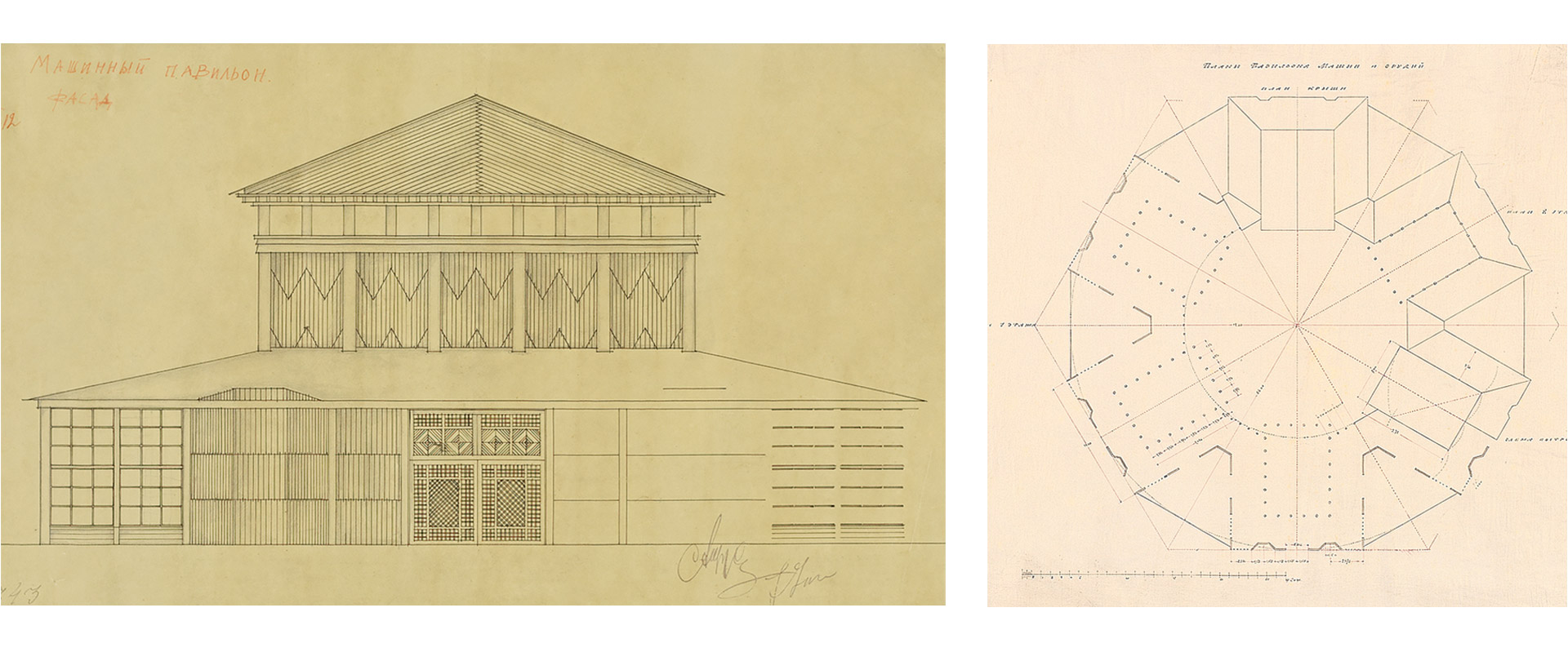 right: Ivan Zholtovsky, Design for the Machines and Tools Pavilion. Plan, 1923
